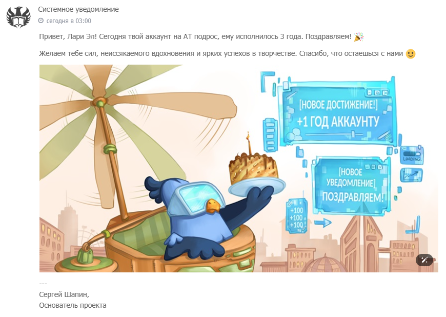 Во всяком случае, свои 2 года и 1 год на АТ я отмечала без таких красивых открыточек.