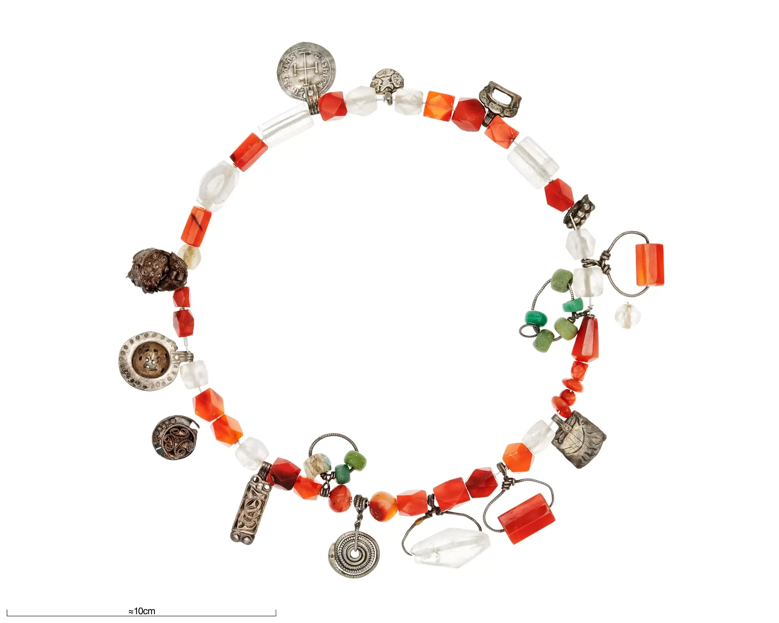 Ожерелье состоит из бусин из горного хрусталя, сердолика и стекла, а также из 15 различных подвесок, в том числе византийской монеты императора Феофила (годы правления 829—842). Судя по прорисовке плана захоронения, ожерелье не было надето на шею, а лежало на груди погребëнной женщины. Хольгер Арбман даже предположил (ещë в 1930-ых годах) , что оно могло быть и нашитым на одежду.