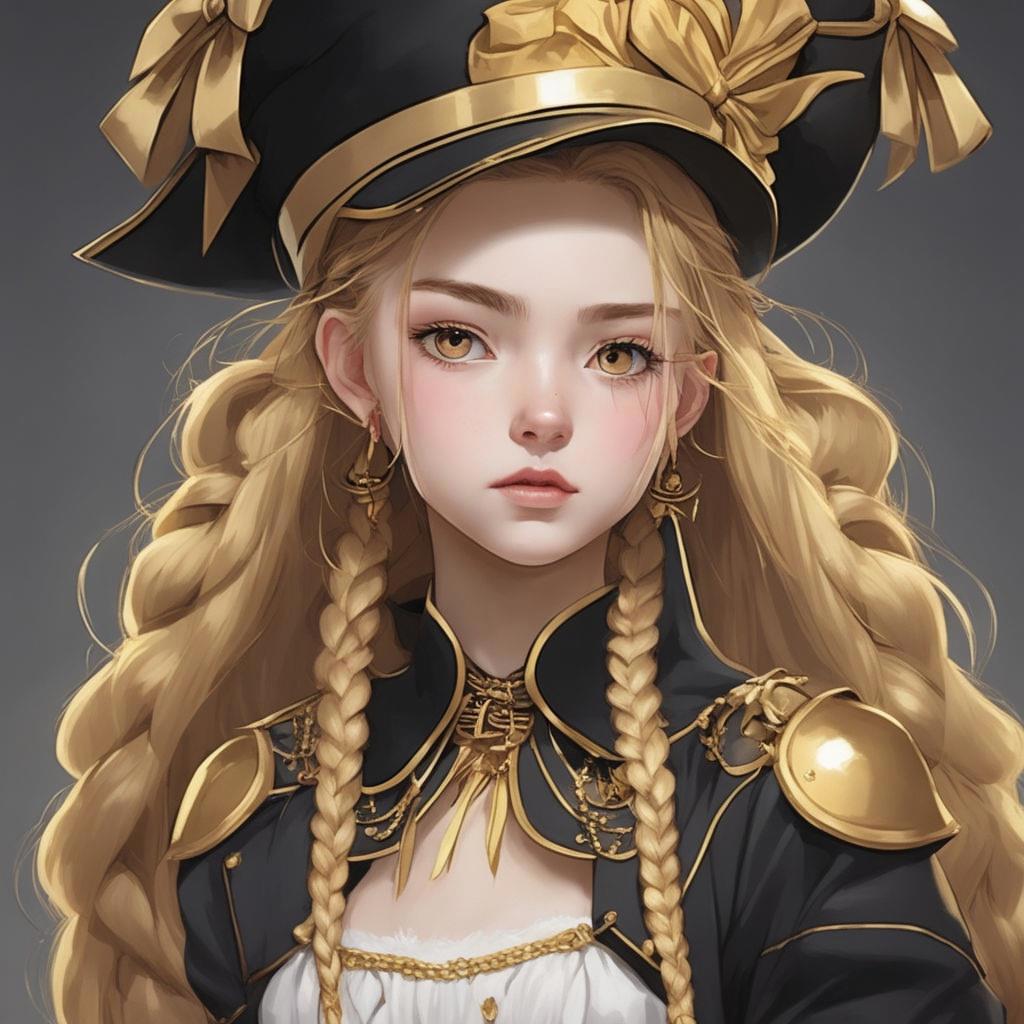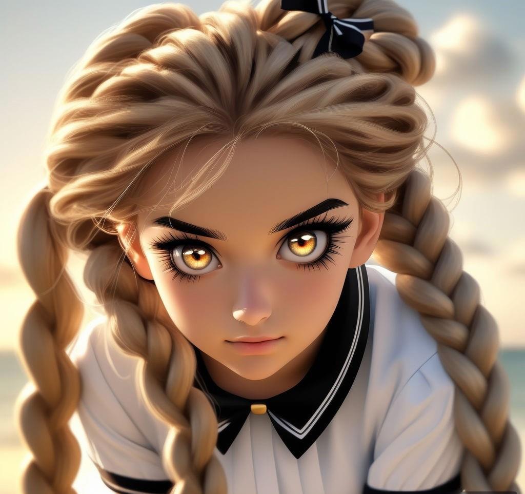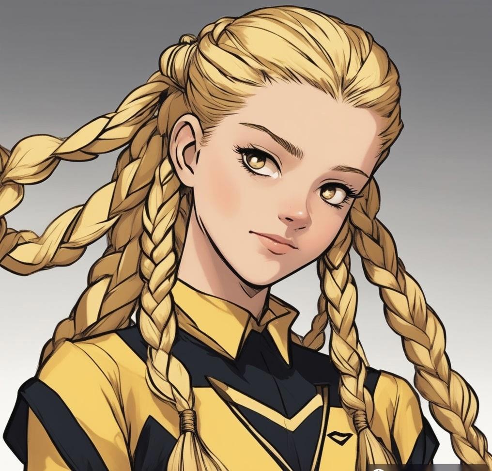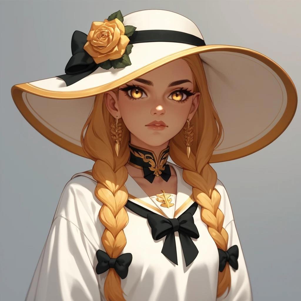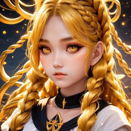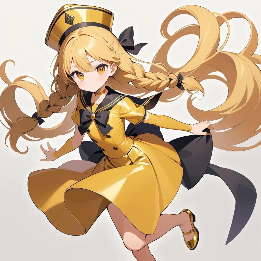 Шестнадцатилетняя девочка с золотой кожей и длинными золотыми волосами, заплетенные в две косы, а также с золотыми глазами и черными ресницами в золотой матроске с черными бантами на груди и сзади и золотых туфельках на низком каблуке