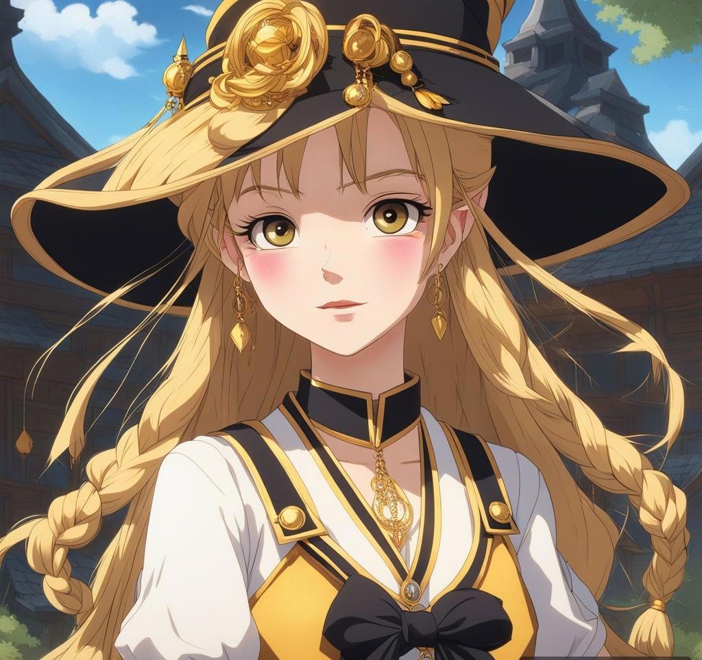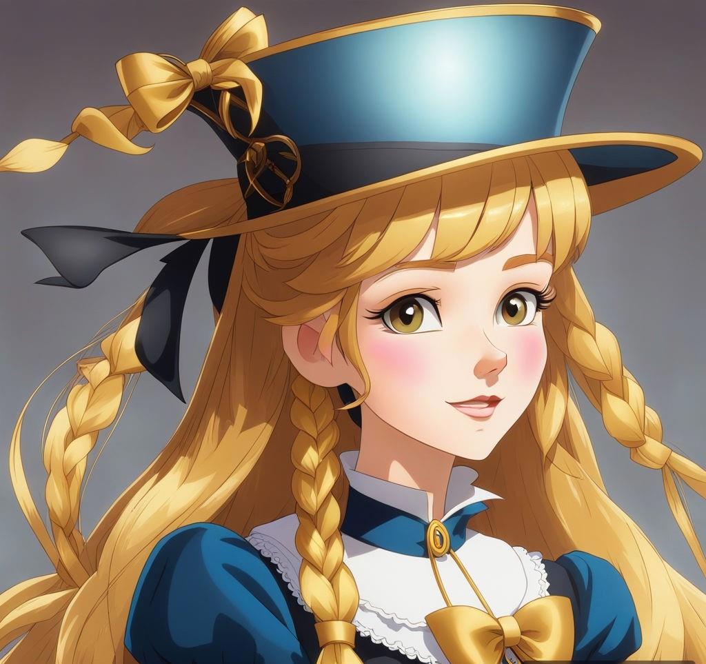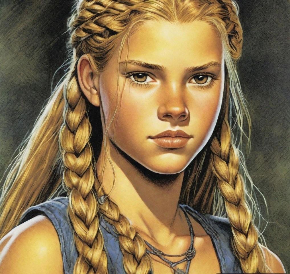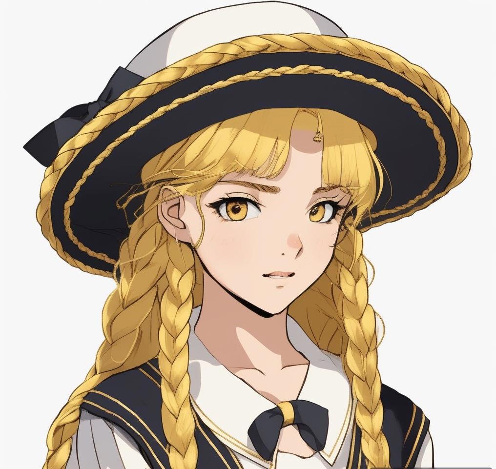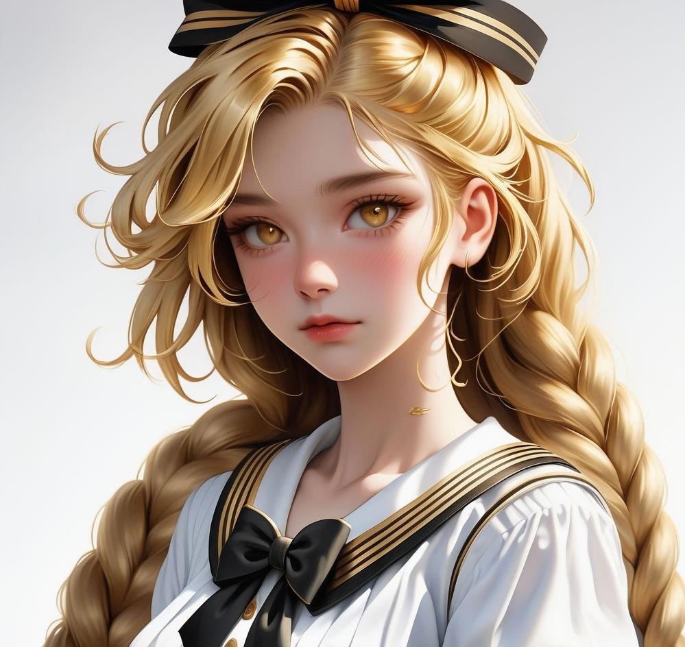 Шестнадцатилетняя девочка с золотой кожей и длинными золотыми волосами, заплетенные в две косы, а также с золотыми глазами и черными ресницами в золотой матроске с черными бантами на груди и сзади и золотых туфельках на низком каблуке
