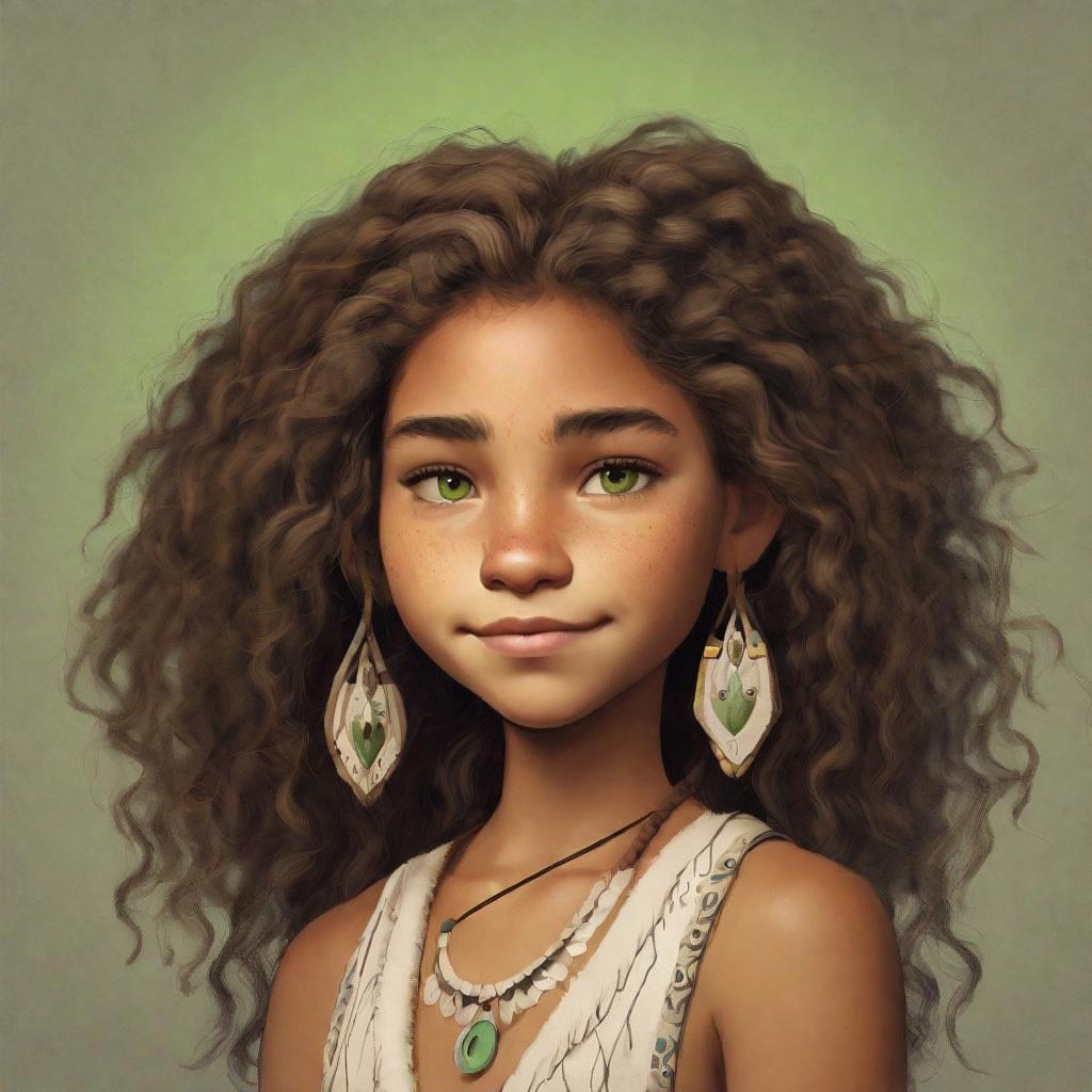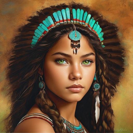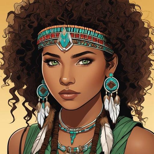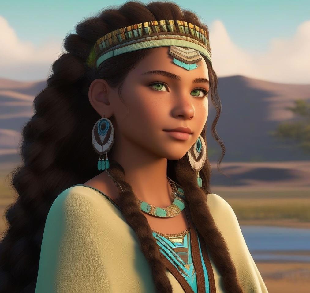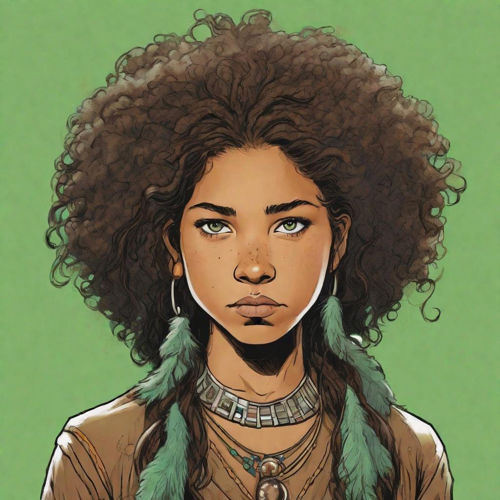 Шестнадцатилетняя девушка-североамериканская индианка из племени Дакота с светло-зелеными глазами и каштановыми волнистыми волосами, собранными в прическе "афро"