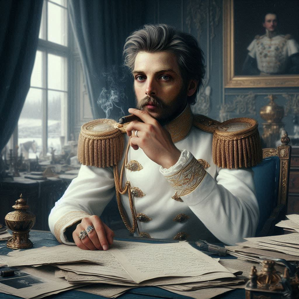 Перед императором – круглый столик для бумаг, на письменном столе – бумаги и книги. Там же открытая коробка с сигарами. До отъезда бабиньки Саша ни разу не видел папа́ курящим.