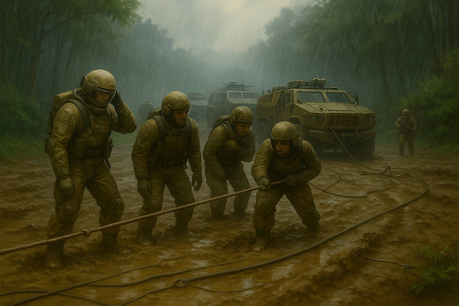 Не сдюжили именно машины. Тохшане берегли энергоячейки, поэтому в бой бросили старую, проверенную временем технику с двигателями внутреннего сгорания. Богатая топливная смесь превратила её в недвижимое имущество. Солдаты пытались лебёдками выдернуть хоть один броневик, с трудом тянули тросы к лесу, но безуспешно: под тяжестью увязших машин деревья вырвало вместе с корнями. По щиколотку в грязи и воде, в неудобных скафандрах люди только скользили и неуклюже падали в грязь. Весёлая возня быстро закончилась унынием и глухим раздражением, подогреваемым тревогой — а ну как враги полезут обратно из леса?