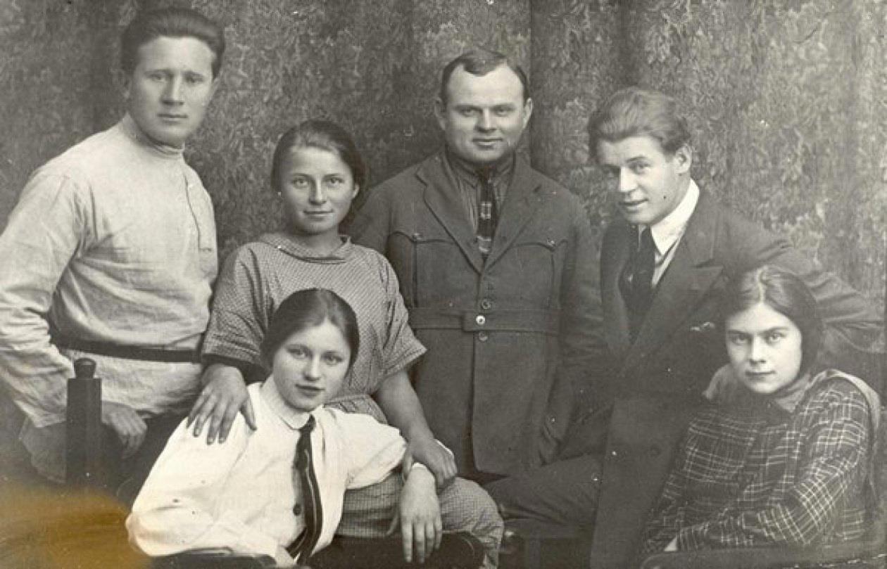 На фото слева направо — поэт Василий Наседкин (будущий муж Екатерины Есениной), Екатерина Есенина (в белом), Александра Есенина, Александр Сахаров (издательский работник, друг Сергея Есенина из Ленинграда), Сергей Есенин, Софья Толстая (последняя жена поэта и внучка Льва Толстого).