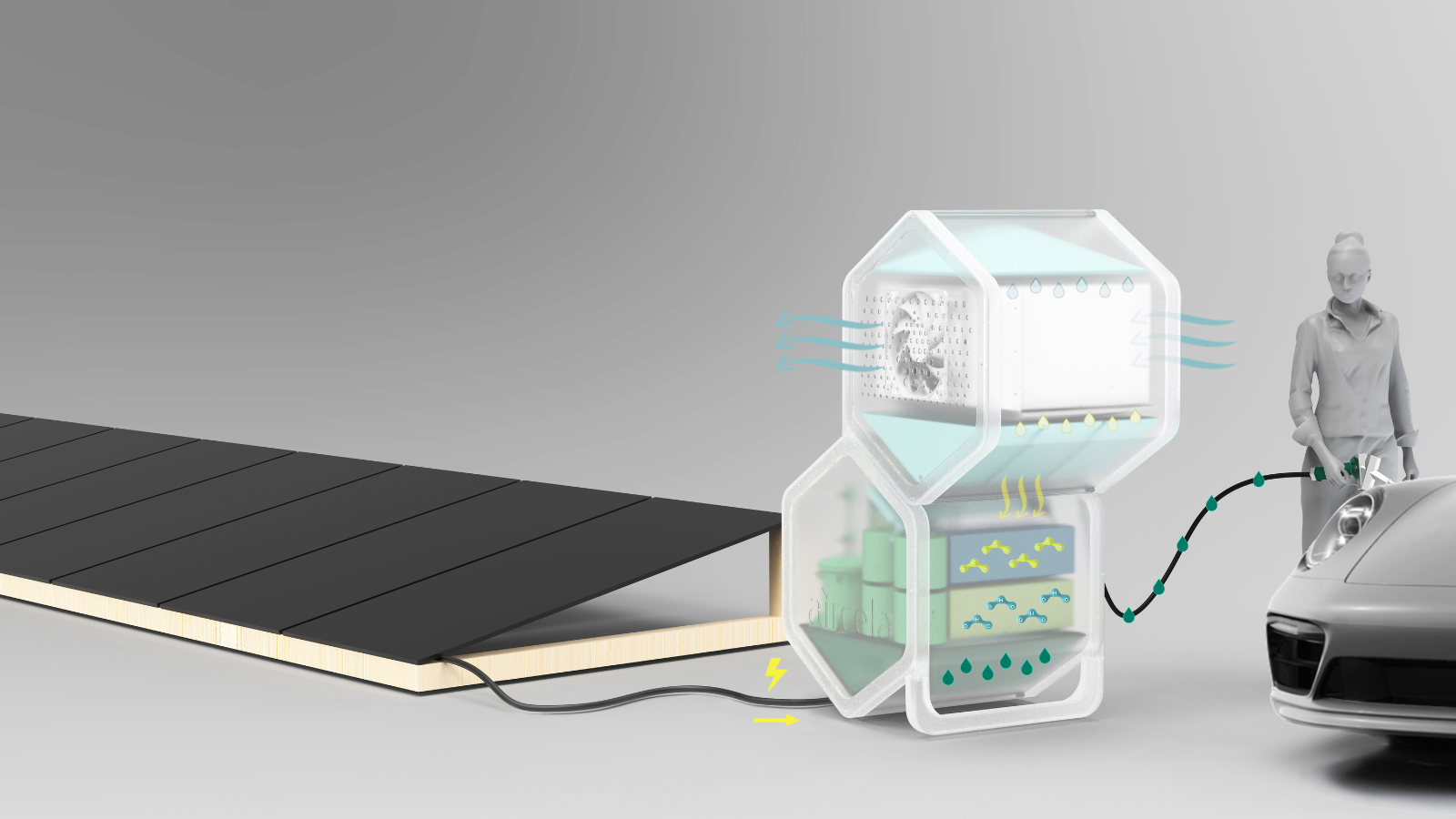 В конструкции устройства присутствуют три крупных синих шестиугольных элемента: два расположены внизу, а один — наверху. Каждый из них выполняет свою функцию: один отвечает за сбор воздуха, а другой — за производство топлива.
