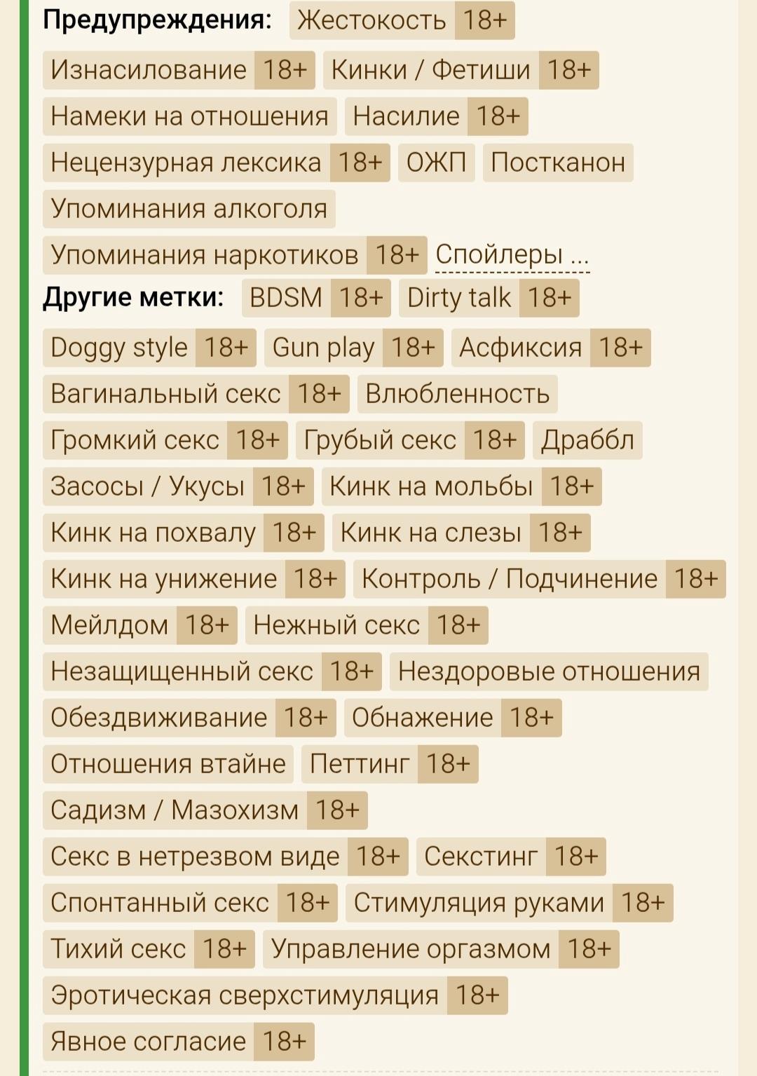 И решил я - раз дочери ОЧЕНЬ понравилось, возможно, ей будет интересно почитать фанфики на сериал. Наверняка что-то есть на фикбуке. Читать по-русски она умеет. Заглянул. И теперь к заголовку блога. ЧТО У НИХ ТАМ В ГОЛОВАХ? Приведу скрин с перечислением предупреждений только одной взятой наугад работы. Разумеется, без названия оной.