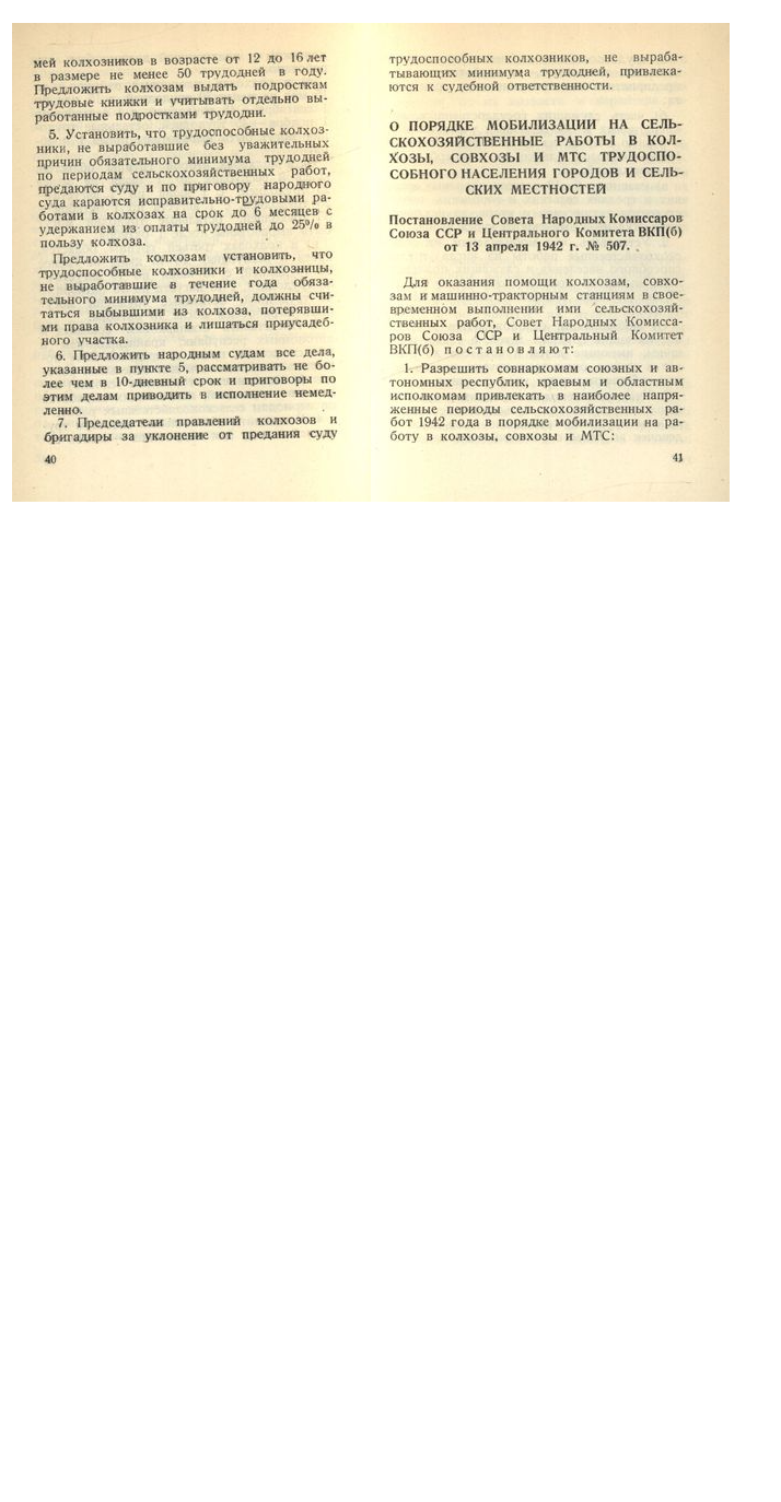 В СССР действовал обязательный минимум трудодней в год для трудоспособного колхозника. В апреле 1942 года, в условиях войны, обязательный минимум трудодней был увеличен и установлена уголовная ответственность за его невыполнение.