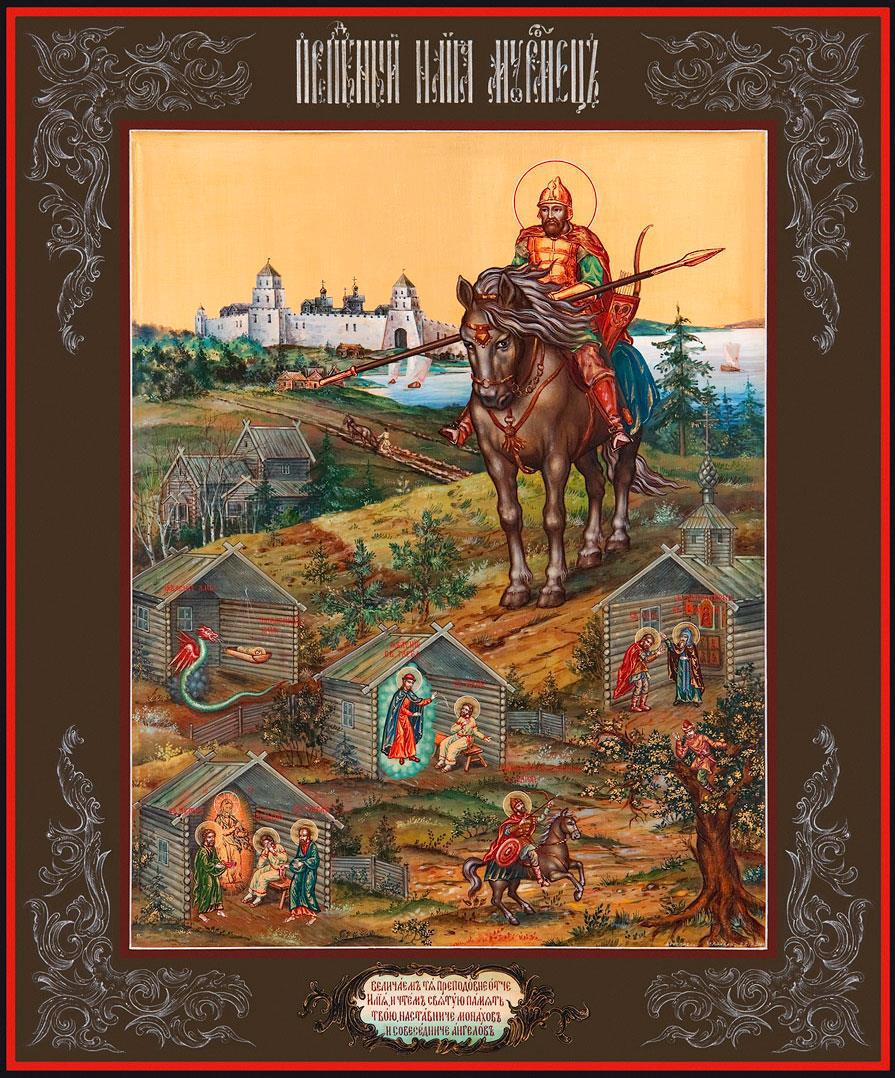 Кстати, нашёл очень необычную икону преподобного Илии Муромского, эпизод с Пресвятой Троицей в нижнем левом углу:
