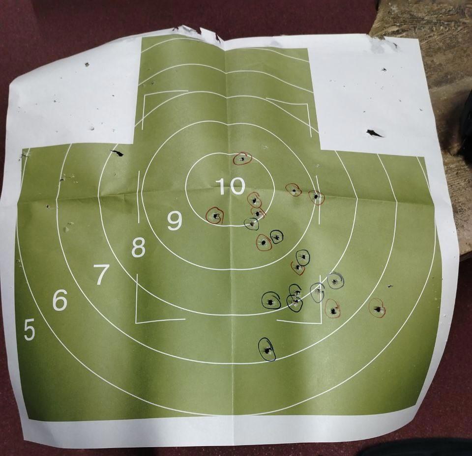 А это мишень после 2х серий по 10 выстрелов. Синие - первые выстрелы, красные - уже с корректурой по первым. После 15го выстрела уже болело отбитое плечо, поэтому попадания начало отрывать, хотя первые красные зашли хорошо.