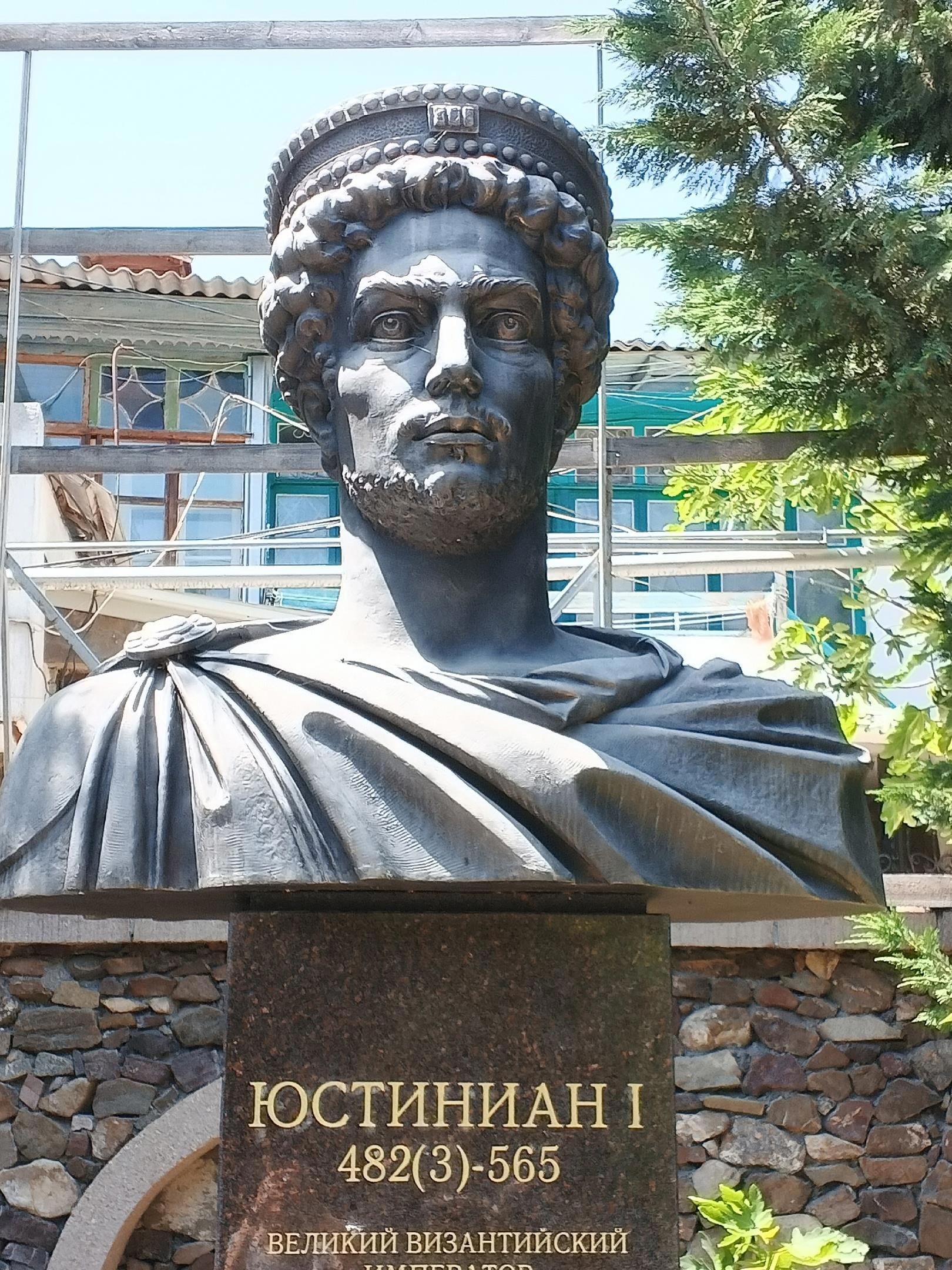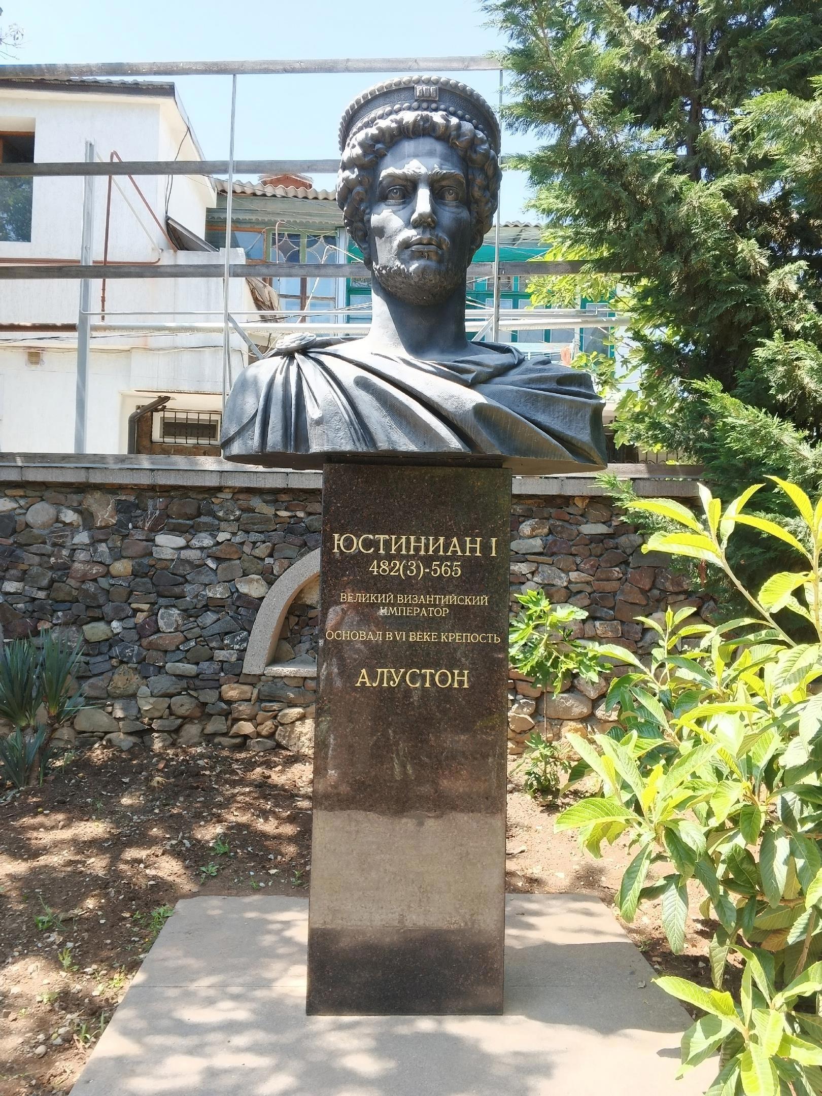 А дальше мы увидели над деревьями кусочек древней кладки и обнаружили рядом крохотный скверик с памятником византийскому императору Юстиниану, который и дал приказ о строительстве Алустона.