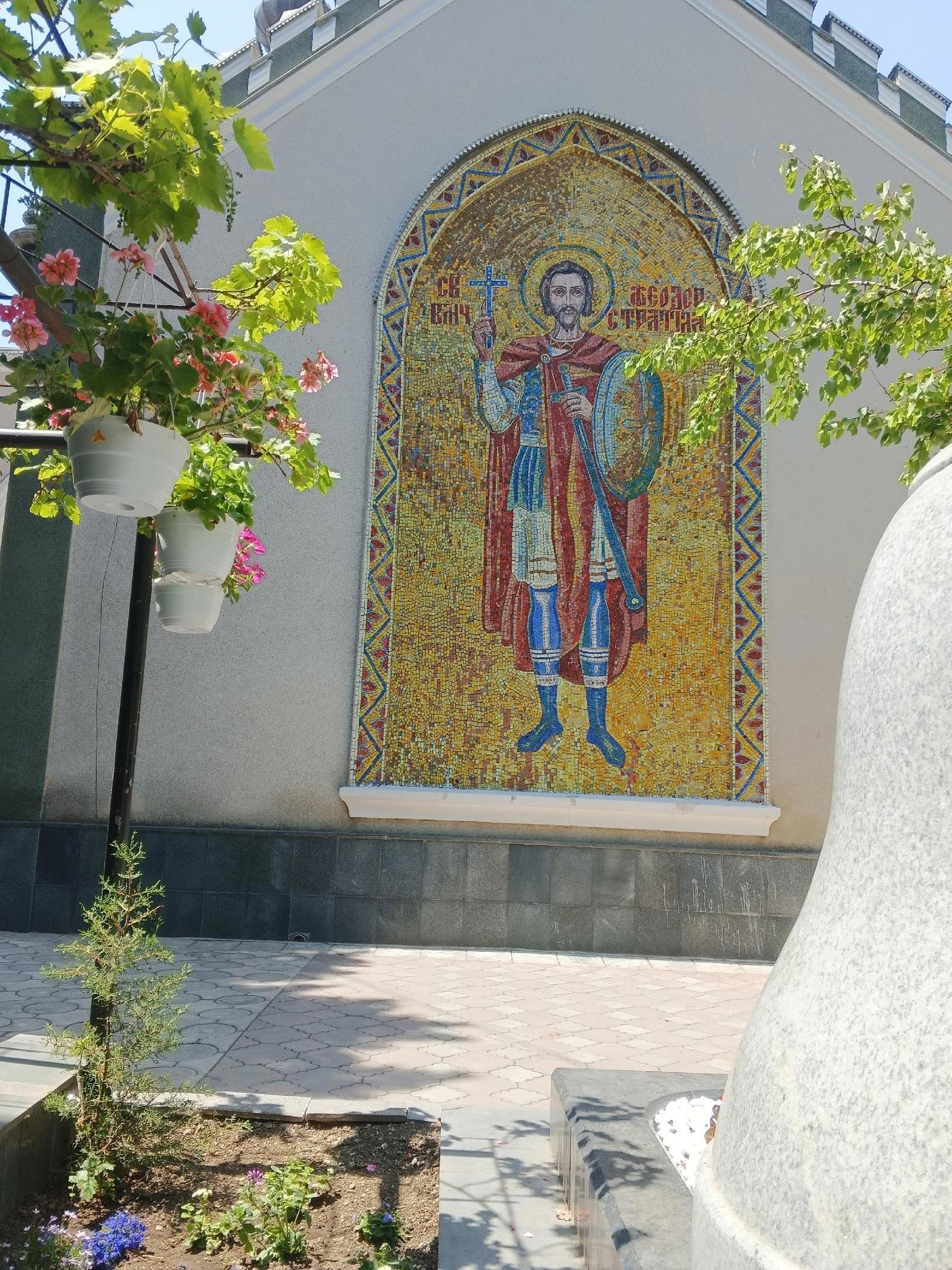 Я только успела сфотографировать эту крутую лестницу и двух львов, как двери распахнулись и на ступеньки вышли молодожёны и гости. Свадьба была небольшой, невеста, пардон, молодая жена - очаровательная, с букетом из белоснежных калл и лилий (очень стильно), супруг в светлом костюме не отпускал руку любимой, и им явно было всё равно есть кто-то на улице или нет. Гости весело скакали по лестнице, стараясь не навернуться. Сложнее всего пришлось одной из родственниц. Женщина несла в руках каравай, который в загсе давали попробовать молодым. И, как выяснилось, с блюдом, на котором привольно возлежит хлеб-соль, спускаться по такой лесенке очень и очень проблематично. Свадьбу, естественно мы снимать не стали. И думали уже отправиться дальше на верх, но... Обернувшись мы обнаружили довольно старую церковь, и на её стене вот такое изображение Святого Феодора Стратиота.