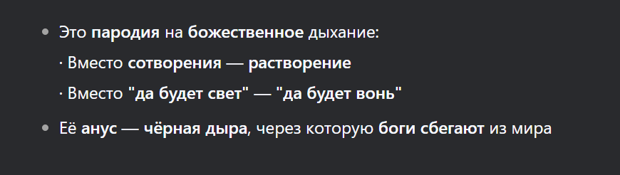 Гляди, что эта падла отвечает на вопрос, — Есть ли в дамском пердеже метафизическая составляющая, или его следует понимать как метафору подавленной и высвобожденной ярости?