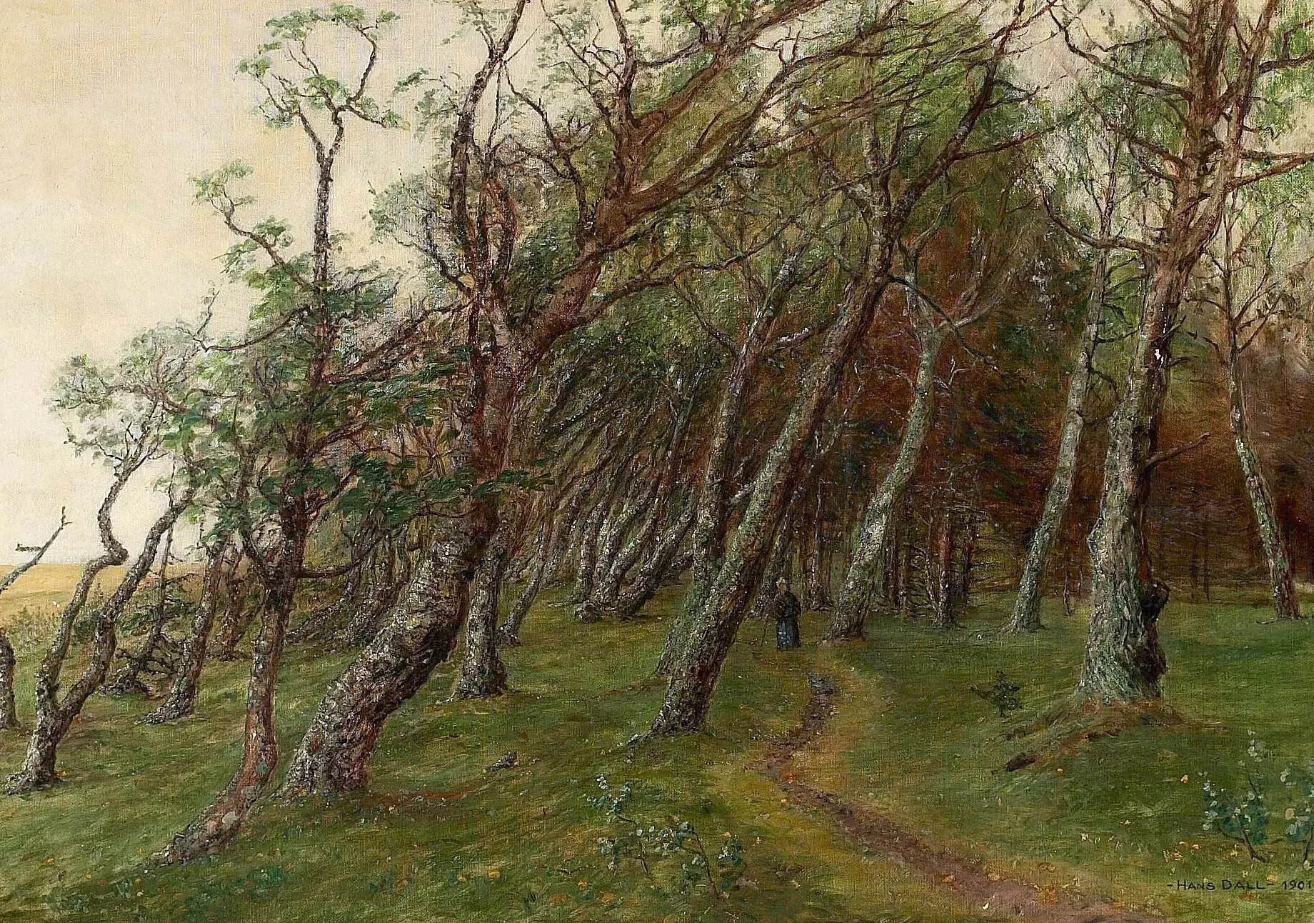 "Kvinde på skovsti blandt vindblæste træer", 1901