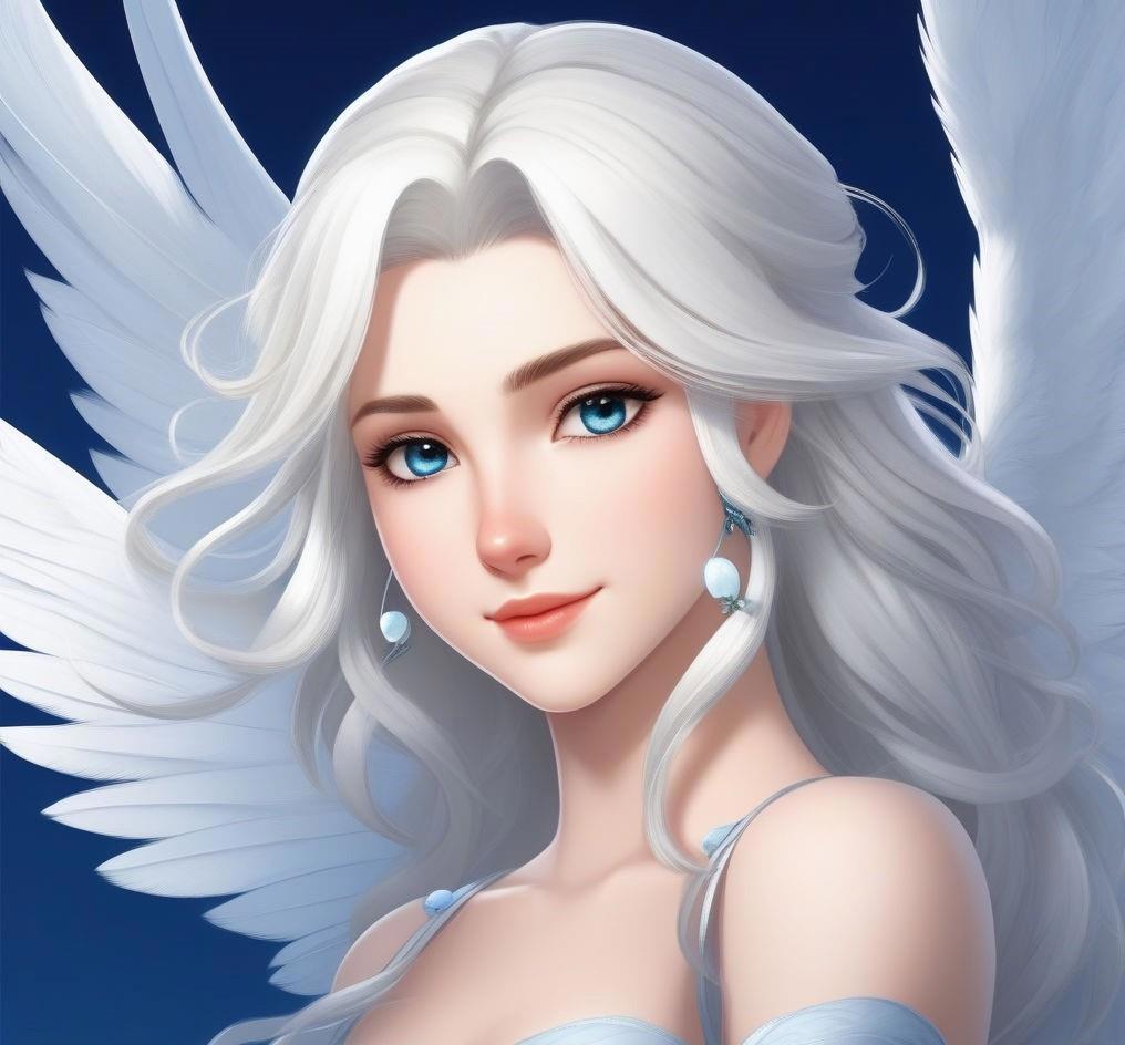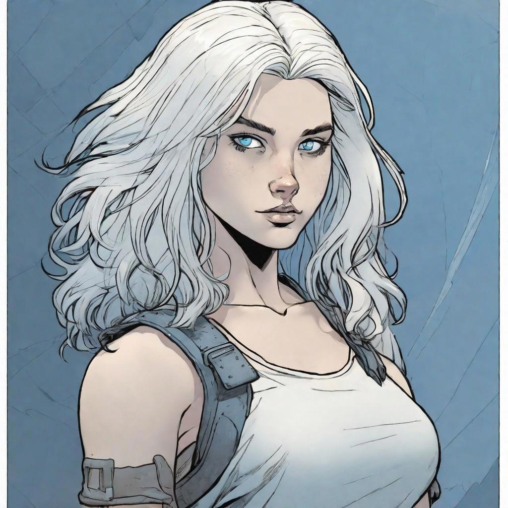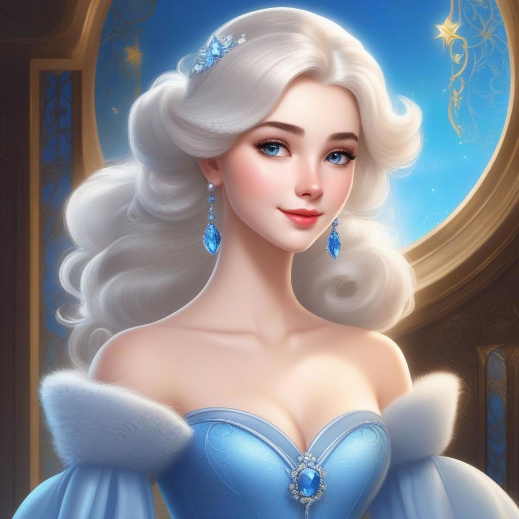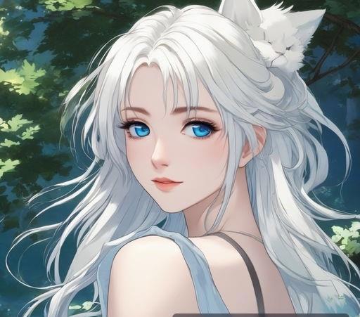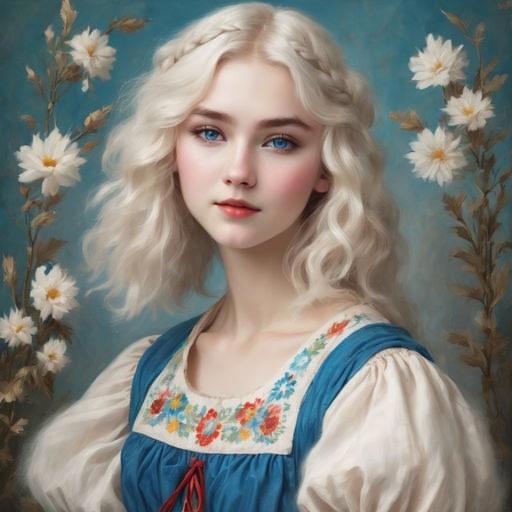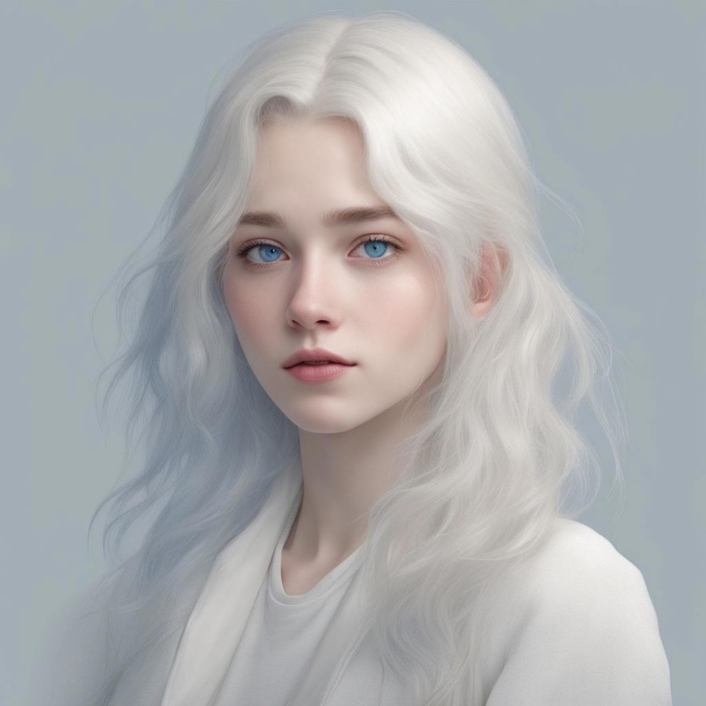 девятнадцатилетняя девушка с белой кожей с пушистыми белыми волосами до плеч, с голубыми глазами