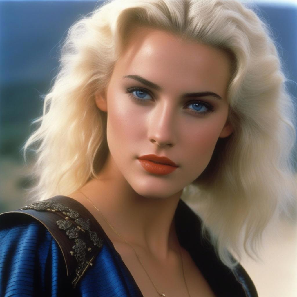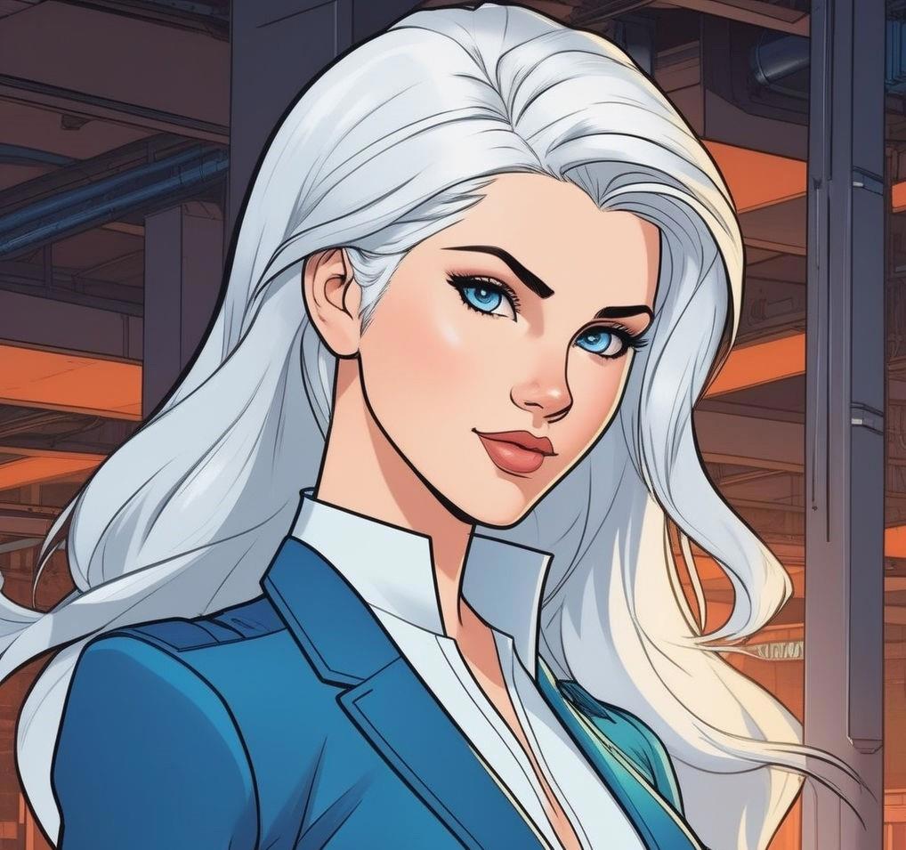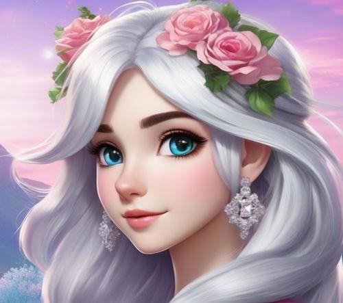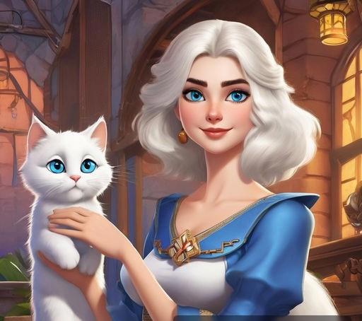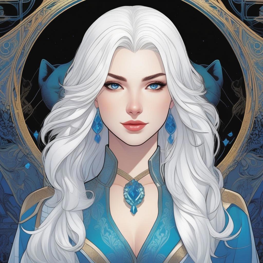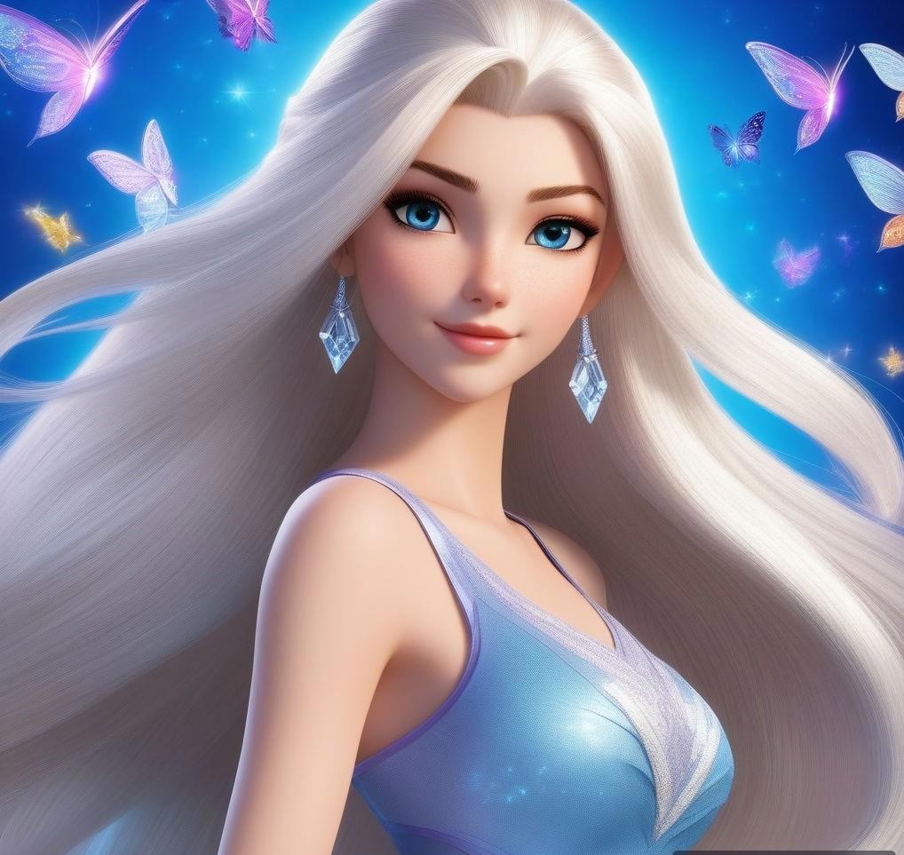 девятнадцатилетняя девушка с белой кожей с пушистыми белыми волосами до плеч, с голубыми глазами