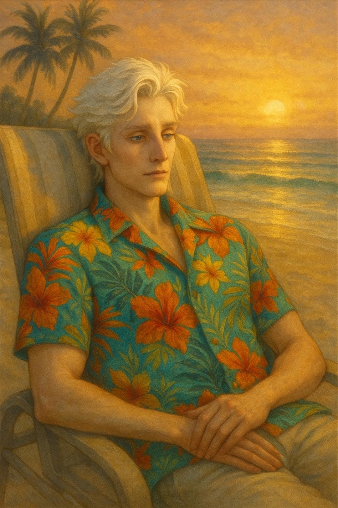 Вообще, создавая Хранителей, я опиралась на древнюю мифологию разных народов мира. Оттуда же я брала и идею пола для них. В некоторых культурах ушедших лет божество Солнца было мужского пола — Аполлон, Гелиос, Амон-Ра, Сурья, Даждьбог... А в других оно, соответственно, было женским. Но я, как единоличный творец своих собственных историй, имею право избрать то, что пришлось по душе конкретно мне, поэтому в итоге мы имеем красивого статного белокурого мужика — и в следующий раз я попрошу ChatGPT создать его уже без этой гавайской рубашки, дабы ублажить свой взор ещё больше.