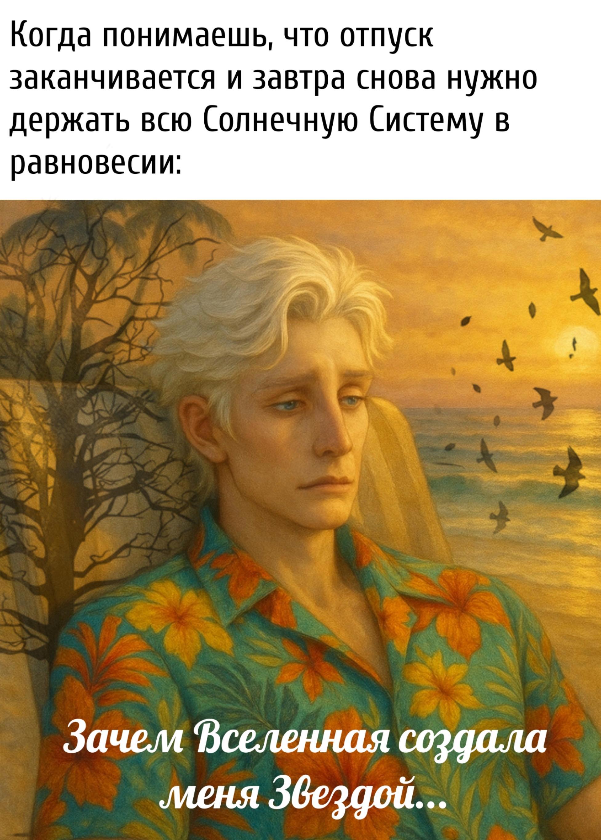 Ладно, если говорить без лишних эмоций, то речь идёт об одной главе из второй книги «Космические Хранители». Читатели осведомлены о моей любви к лучшему (для меня) персонажу оттуда. Это — Хранитель Солнца. Я уделяю много внимания его душевным терзаниям, дабы показать, как тяжело быть Звездой собственной планетарной системы — тем более, если ты ещё и единственная в ней Звезда, которая вынуждена приглядывать за Планетами, Астероидами и Хранителями прочих небесных тел в одиночку. Иногда нужно отдыхать от своих изнуряющих космических обязанностей где-нибудь на Гавайях, лёжа в пляжном шезлонге... И — в облике обычного человека, конечно же. А то другие отдыхающие на Гавайях люди будут смотреть на тебя странно, когда ты заявишься туда в своём истинном виде какого-то пятиметрового человекоподобного создания из космоса с крыльями впридачу.