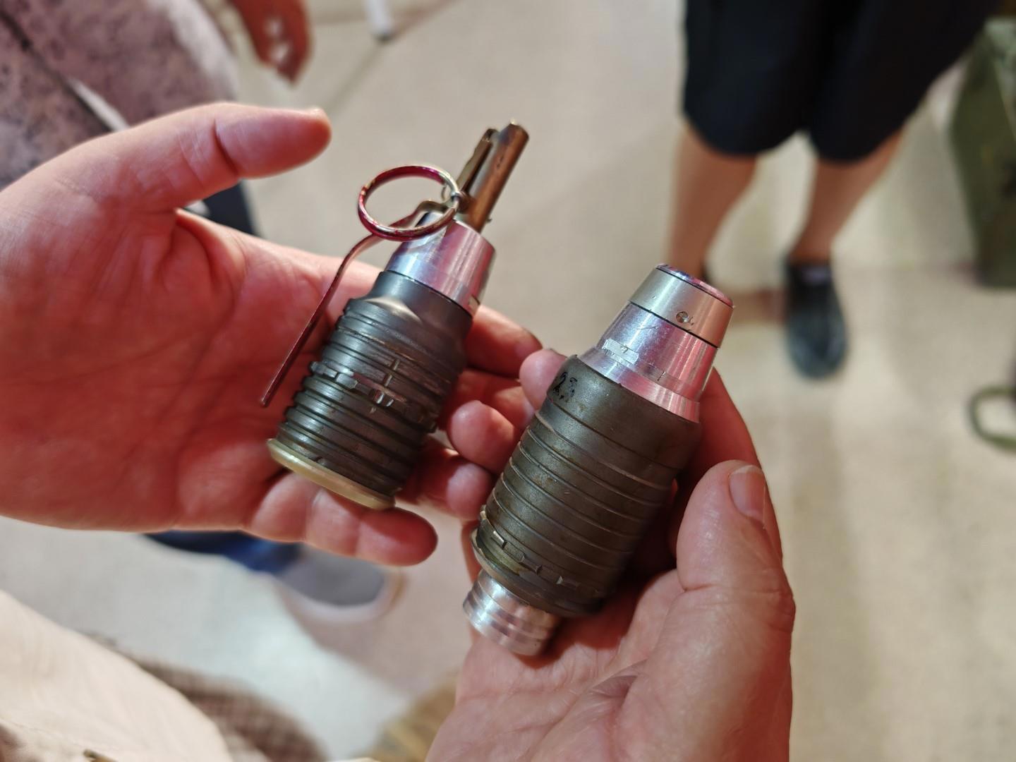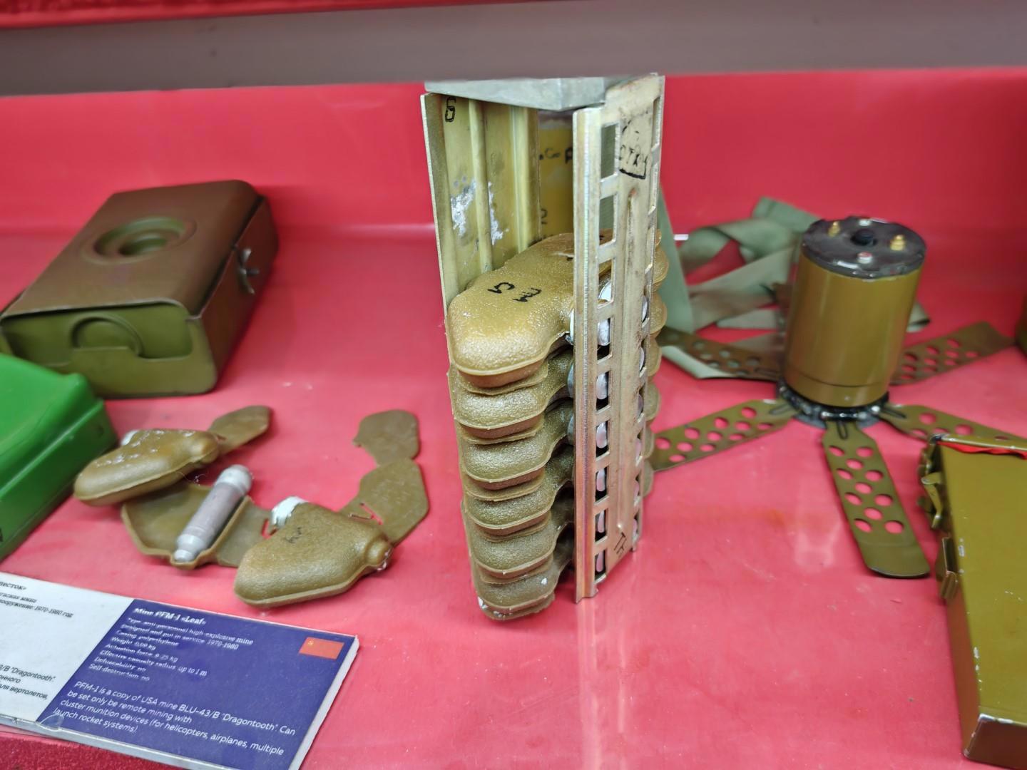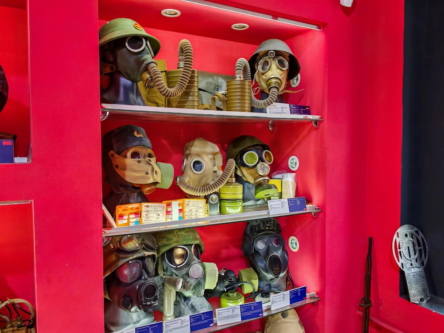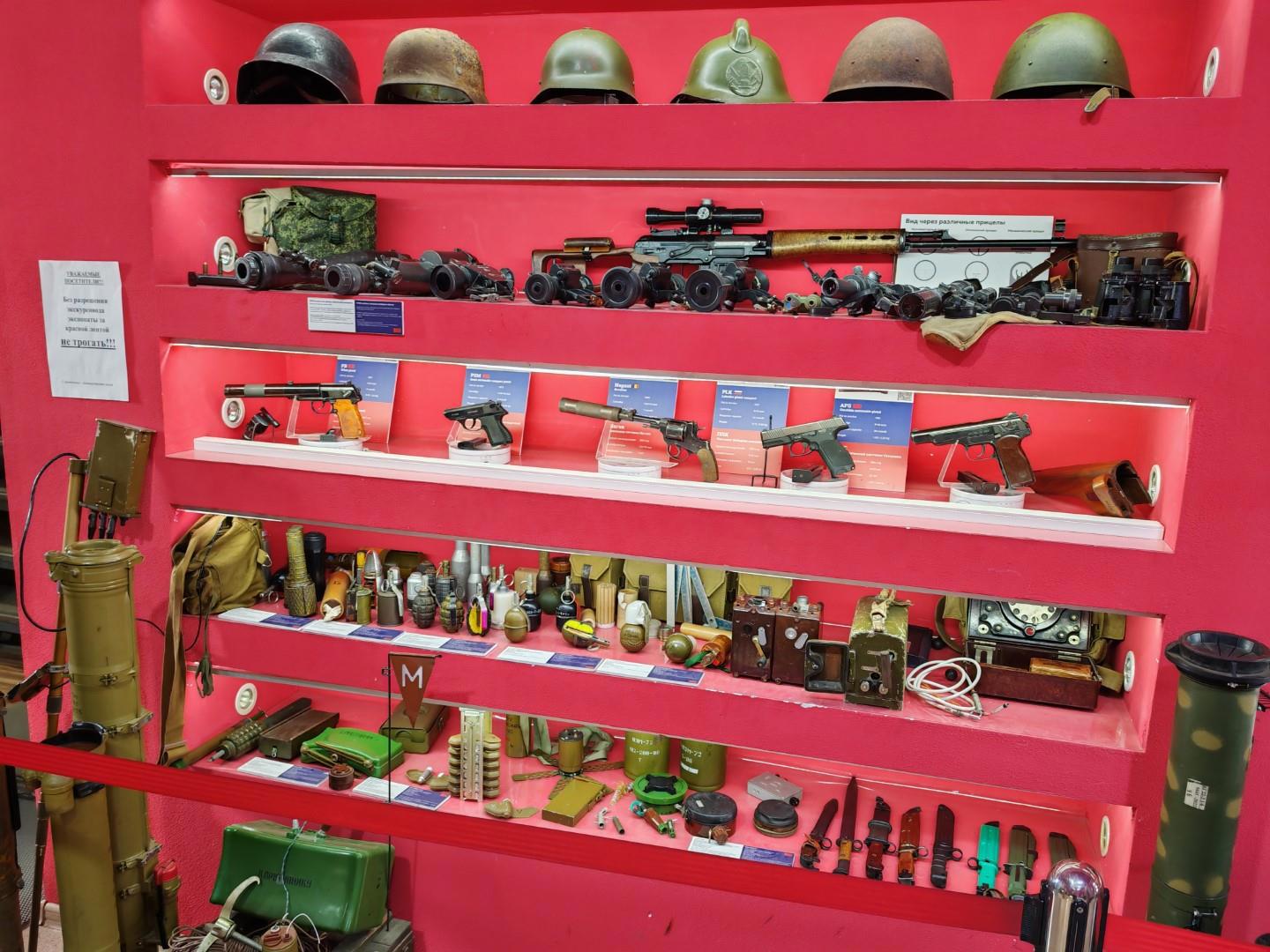Стенд с касками, приборами наблюдения, интересными пистолетами, ручной артиллерией и минами.