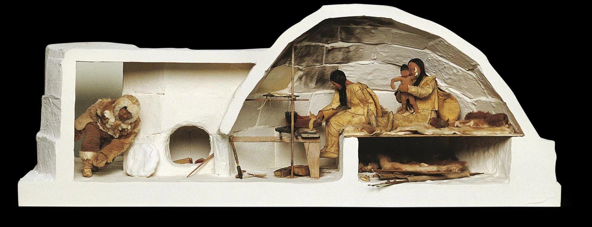 Иглу — самое знаменитое снежное укрытие, ставшее символом человеческой изобретательности в экстремальном холоде. Строили его не из любого снега, а из специально выпиленных ножом блоков, нарезанных из ветром утрамбованного, плотного снега. Эти блоки укладывали по спирали с постепенным наклоном внутрь, создавая купол, который держался сам по себе, без опор. Гениальность конструкции — в ее физике. После постройки внутри зажигали жировую лампу (жирник). Тепло заставляло внутреннюю поверхность снега слегка подтаивать, а потом снова замерзать, образуя прочный ледяной панцирь. Низкий вход-туннель, всегда расположенный ниже уровня пола, был ключом к теплу: тяжелый холодный воздух "стекал" наружу, а легкий теплый оставался внутри. При внешней температуре в -40°C внутри иглу могло быть до +10–15°C. Окошки делали из прозрачного льда или натянутых тюленьих кишок. Опытный охотник возводил такое убежище всего за 1–2 часа, что часто означало разницу между жизнью и смертью в пургу.