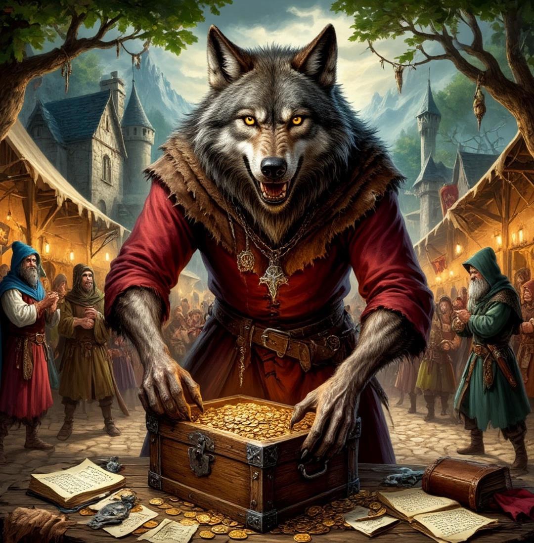 Среди толпы выделялся один человек — высокий, мрачный, с пронзительным взглядом. Это был оборотень по имени Варгул, который славился своей хитростью и изворотливостью. Он пришёл на ярмарку не за покупками, а с совсем другой целью — спрятать свой клад, который он накопил за долгие годы своих приключений.