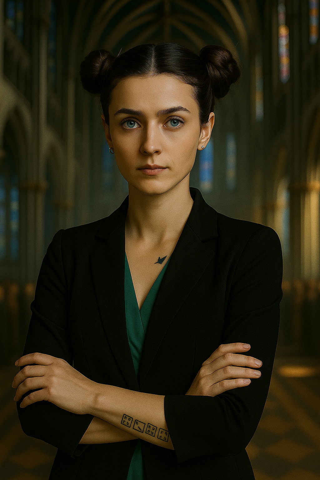 Выше среднего роста, аскетичного телосложения, всегда носит одежду чёрного и изумрудного цвета, предпочитает исключительно деловой стиль. Вежлива, но немного язвительна в общении. На левой руке татуировка в виде пяти кубиков игральных костей с разным количеством выпавших очков. Когда волнуется, начинает слегка задыхаться, страдает от средней тяжести кинофобии (боится собак, крч).