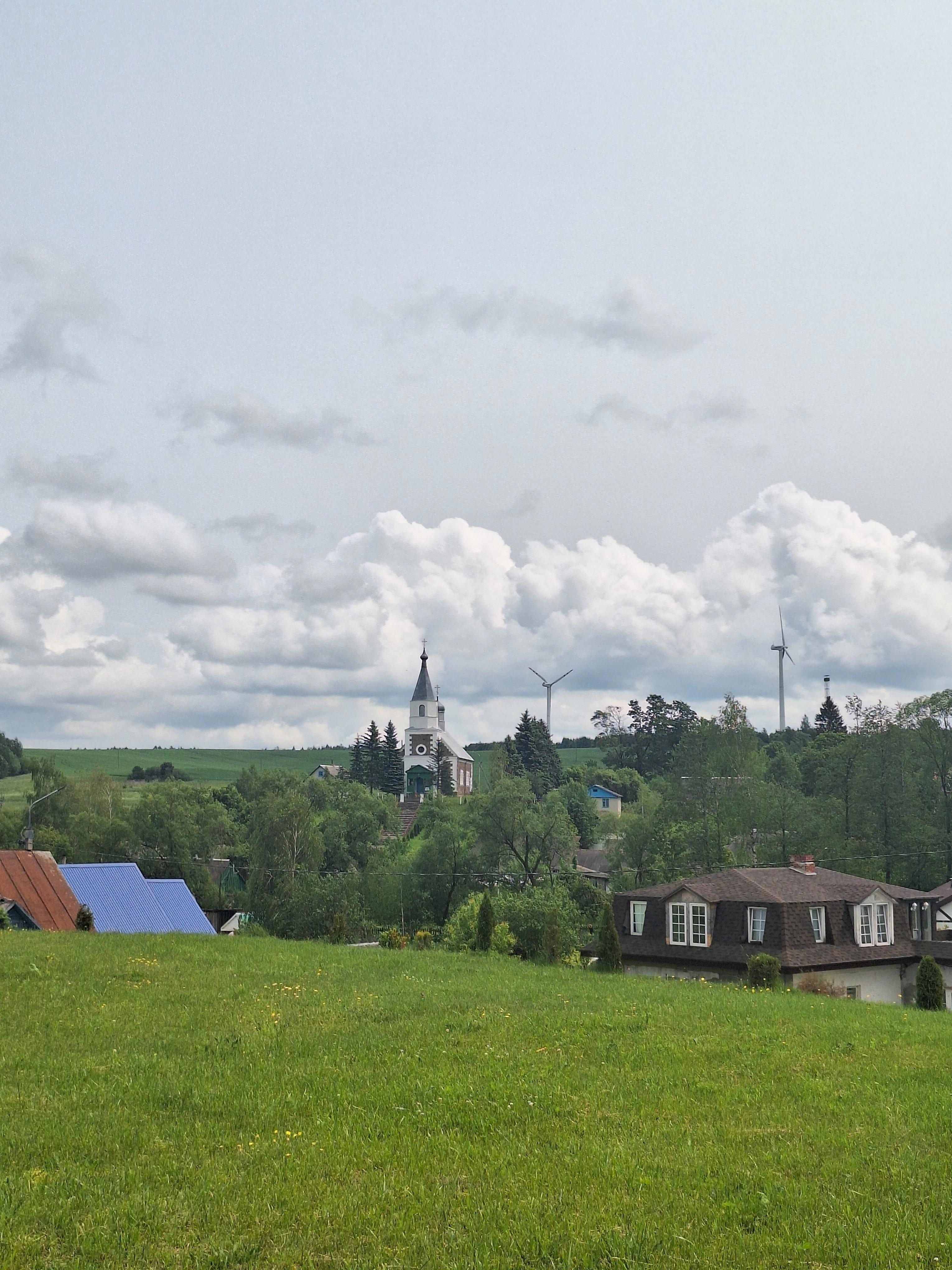 Вид от костела Преображения Господня на Александро-Невскую церковь и пару ветряков