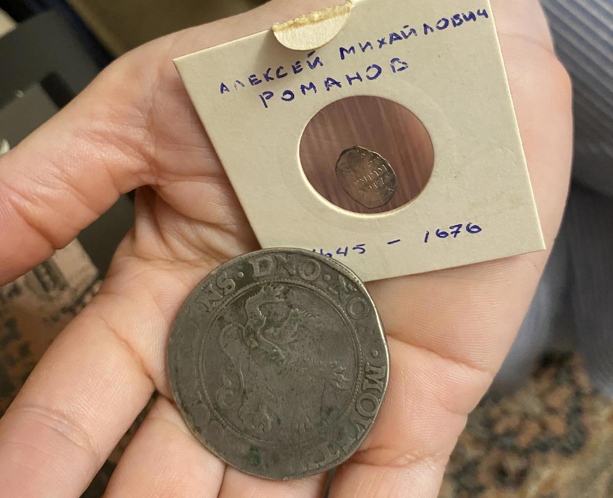 И, знаете, она реально большая и тяжелая. И вот я ее положила рядом с монеткой Алексея Михайловича, того самого — Тишайшего. Чтобы можно было сравнить.