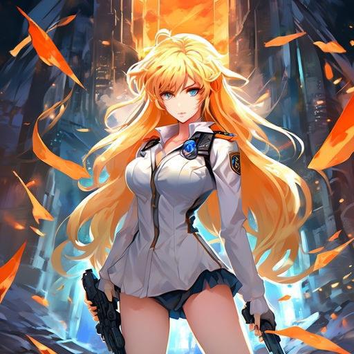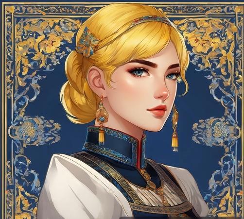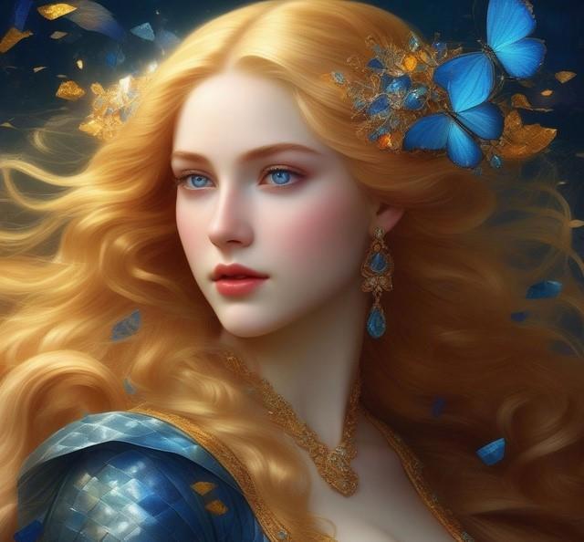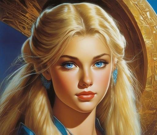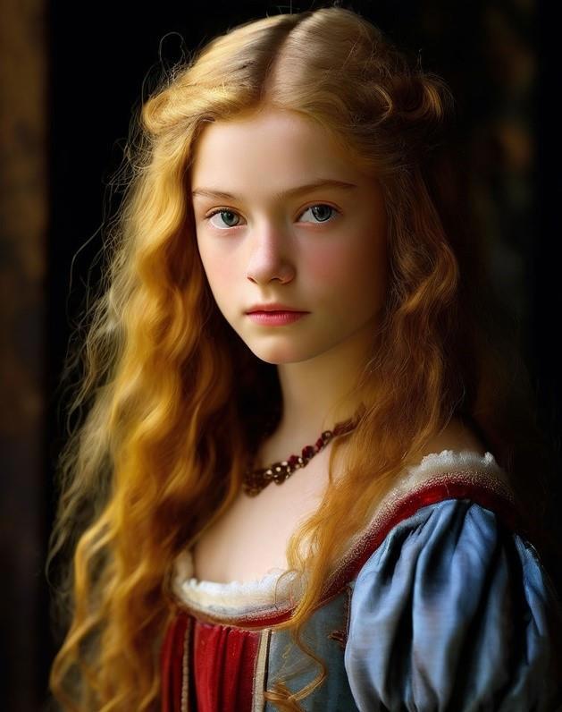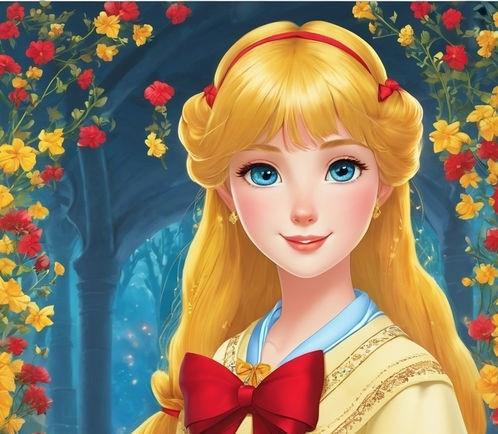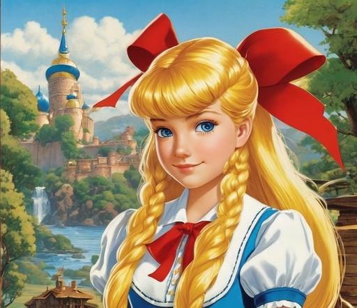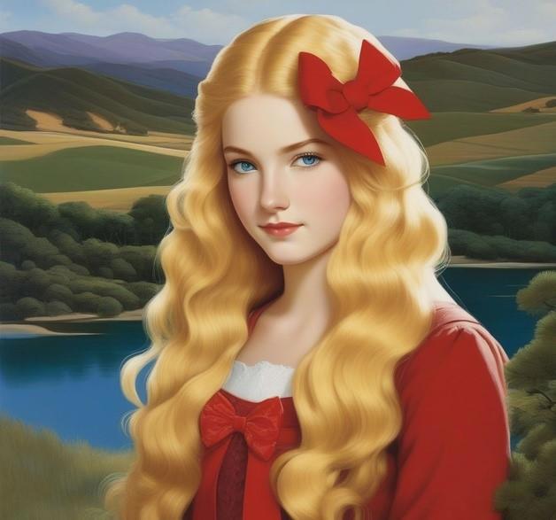 Шестнадцатилетняя девушка с длинными желтыми волосами слегка рыжеватыми и синими глазами; в волосах красный бант