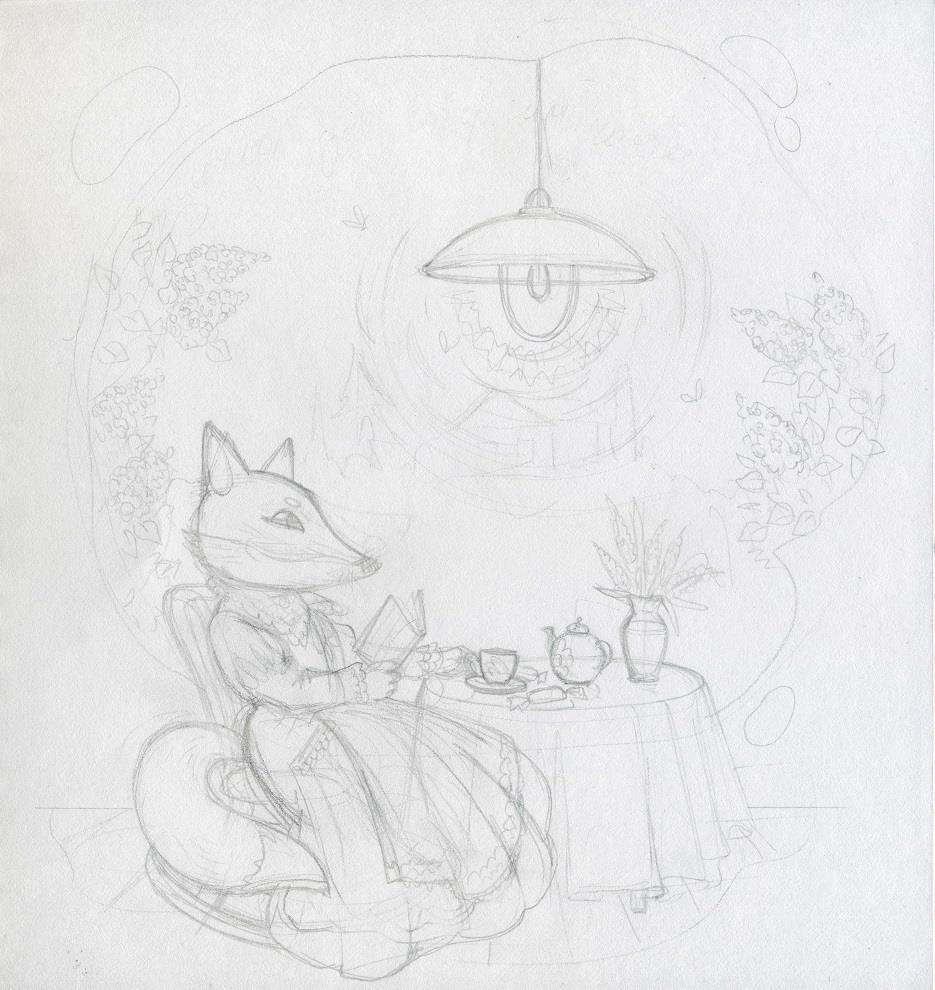 А вот и свеженький эскиз – это примерно так я себе представляю ленивое дачное чтение на веранде, хе-хе) Чаек, вечерок, красота-лепота)