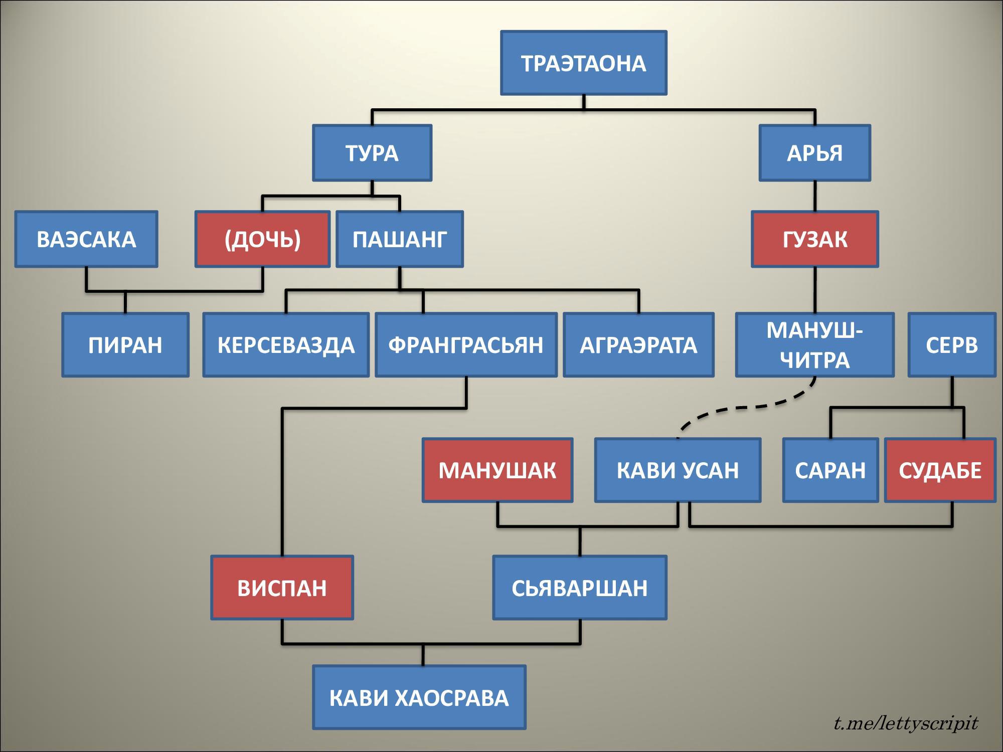 Для протокола: это древо героев моего текста (трилогии? я могу называть его трилогией, да же, да?)), а не мифологических персонажей. В мифах у Траэтаоны-Феридуна, как и положено, три сына - но поскольку для моих целей было достаточно одного злого и одного доброго брата, третий остался за скобками)