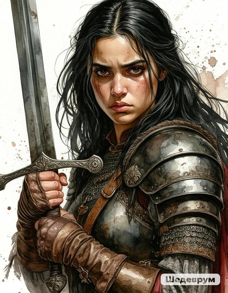 Автор: Анариэль Р.Вот такую обложку сделала своему билингвальному рассказику "Дочь Гнева"\"The Daughter of Wrath", проведя порядка трех часов в обществе ИИ "Шедеврум" (на написание русского текста ушло меньше времени, мда). Мне очень нравится. В любом случае, это самый лучший вариант, потому что ИИ "Шедеврум" не может представить себе женщину-воительницу без бронелифчика, а тут все сложные места прикрыты локтем.