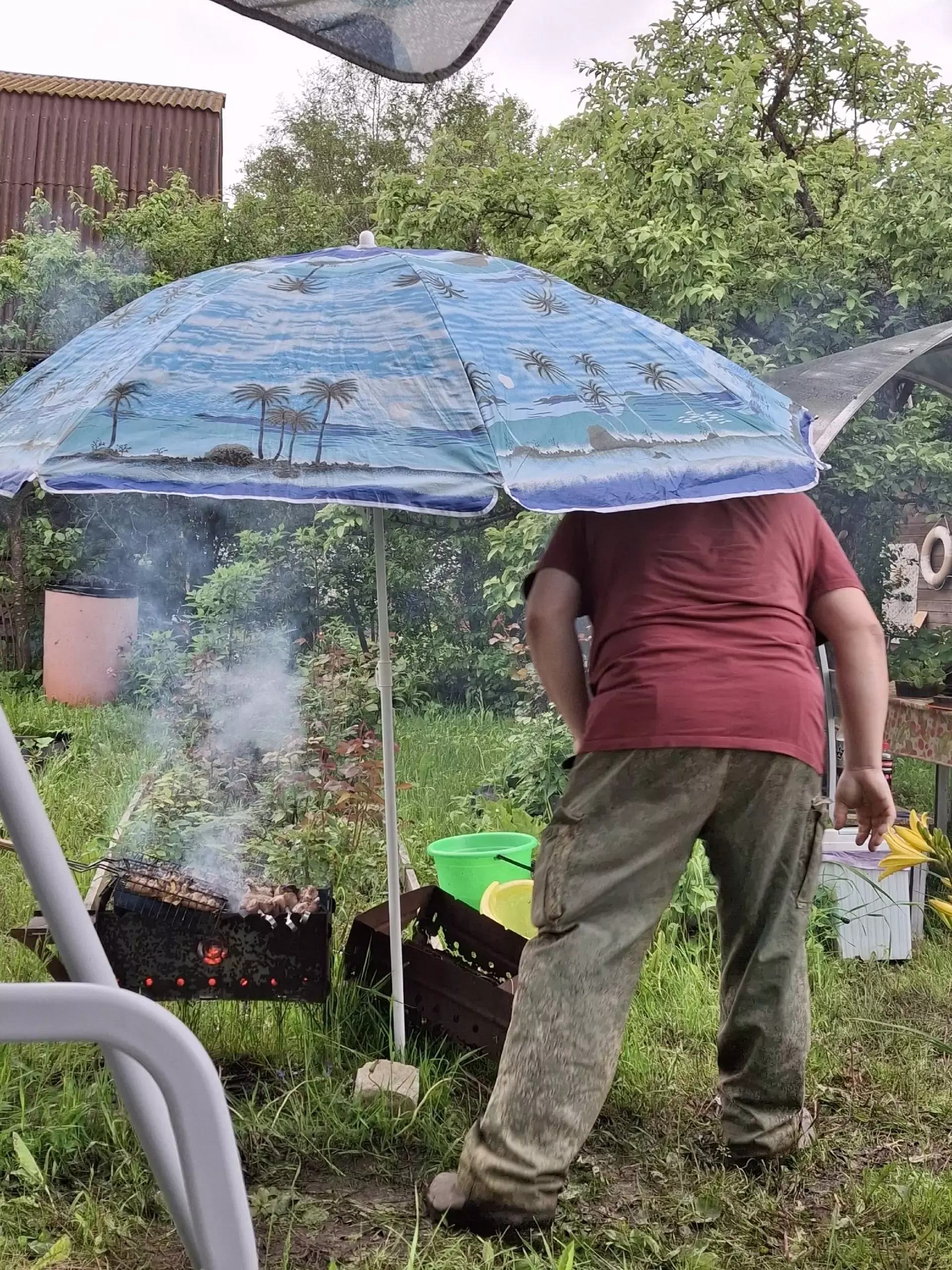 Автор: Николай Владимирович Беляев1. На даче всё плавает. Не припомню, чтобы хоть раз было столько воды. Тем не менее, вчера пошашлычили - правда, с учётом начавшегося очередного дождя защита мангала выглядела примерно так: