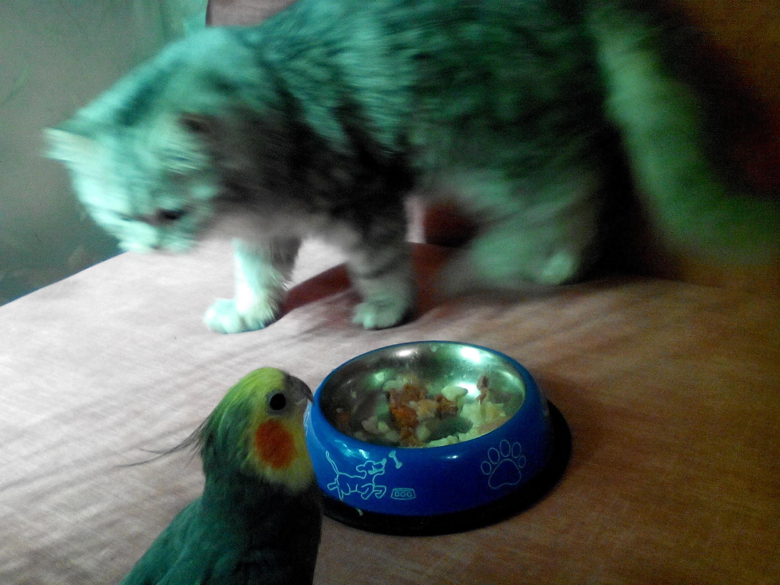 На фото мой попугай (улетевший на радугу) и кошка сестры (она боялась и уважала наглого птицына, который на фото пытается отжать еду в миске).