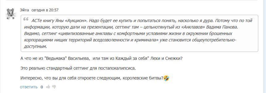 Скажем, Эйту https://author.today/u/ejjjta/works возмутило мое впечатление от пересказа содержания романа Яны Москаленко "Аукцион", сделанное Михаилом Фаустовым на встрече в рамках фестиваля "Планета Омск". То есть сам роман я не читала в тот момент вообще, только слышала о нем то, что рассказывали на встрече.