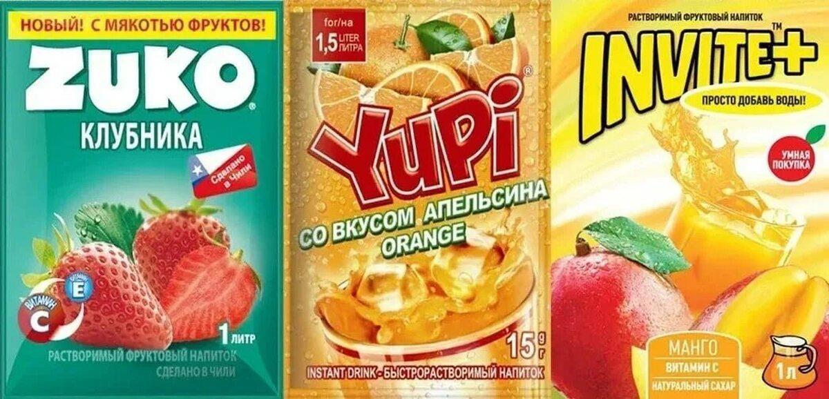 Разводные соки. Сначала Yupi, затем Zuko. Invite как-то прошёл нас стороной. Разводились они вроде как на литр, но мы кидали обычно два на трёхлитровую банку, и было вкусно.