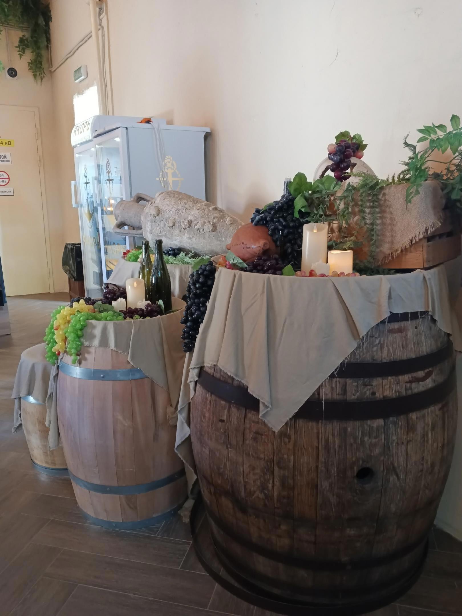 Здесь можно продегустировать крымское вине, выпить чашечку кофе,сока или просто воды. Можно купить свежайшую выпечку. Оформлен зал очень стильно и элегантно.
