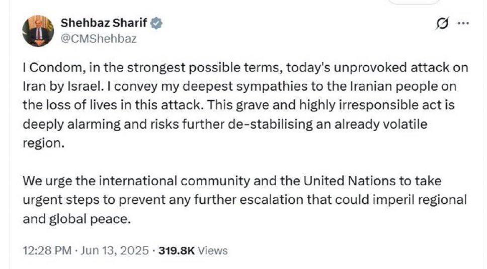 Премьер Пакистана в заявлении в поддержку Ирана и с осуждением действий Израиля вместо фразы "I condemn" ("Я осуждаю") написал "I condom" ("Я гандон презерватив")! В принципе, любой политик может сказать о себе то же самое!