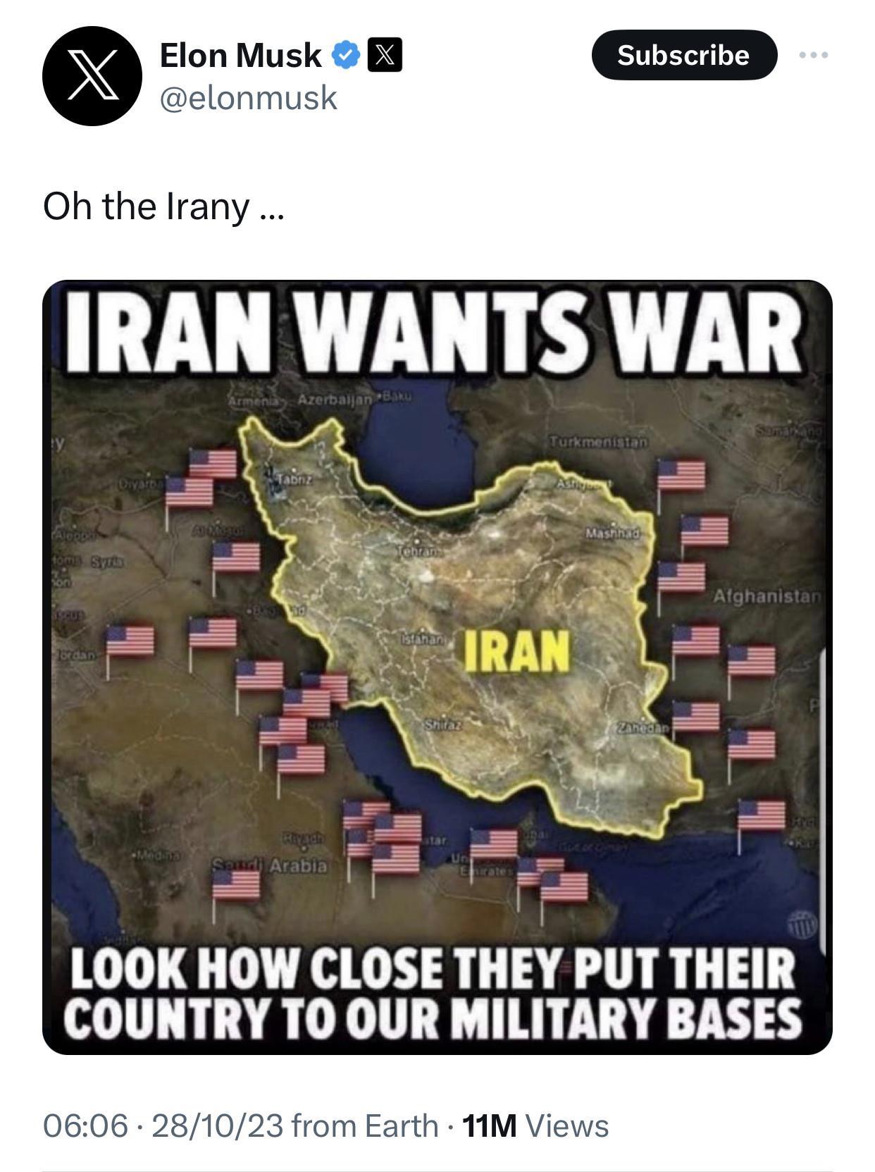 Перевод - «Посмотрите как близко они расположили свою страну к нашим военным базам»! Мало того, оказалось, что Маск ещё и тролль 80 уровня! Он убедил весь мир в том, что он наркоман, а на день рождения Трампа сделал негативный тест на наркотики!