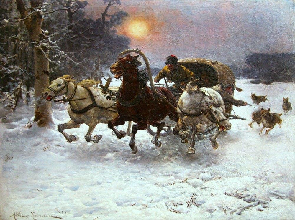 Тройка. Нападение волчьей стаи. Альфред Веруш-Ковальский, 1885 г.