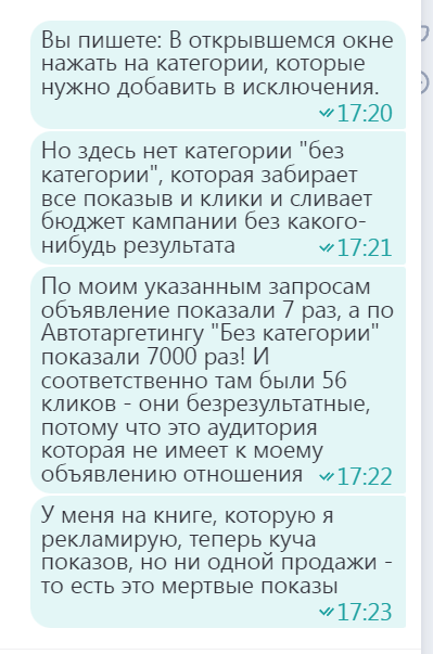 Все отмечают убийственную работу автотаргетинга, который в обход интересов, заявленным владельцем кампании, нагоняет за его деньги народу в сто раз больше (и дальше больше чем в сто раз), причем никаких продаж не происходит, т.е. это незаинтересованные люди, которые никакого отношения не имеют к теме объявления.