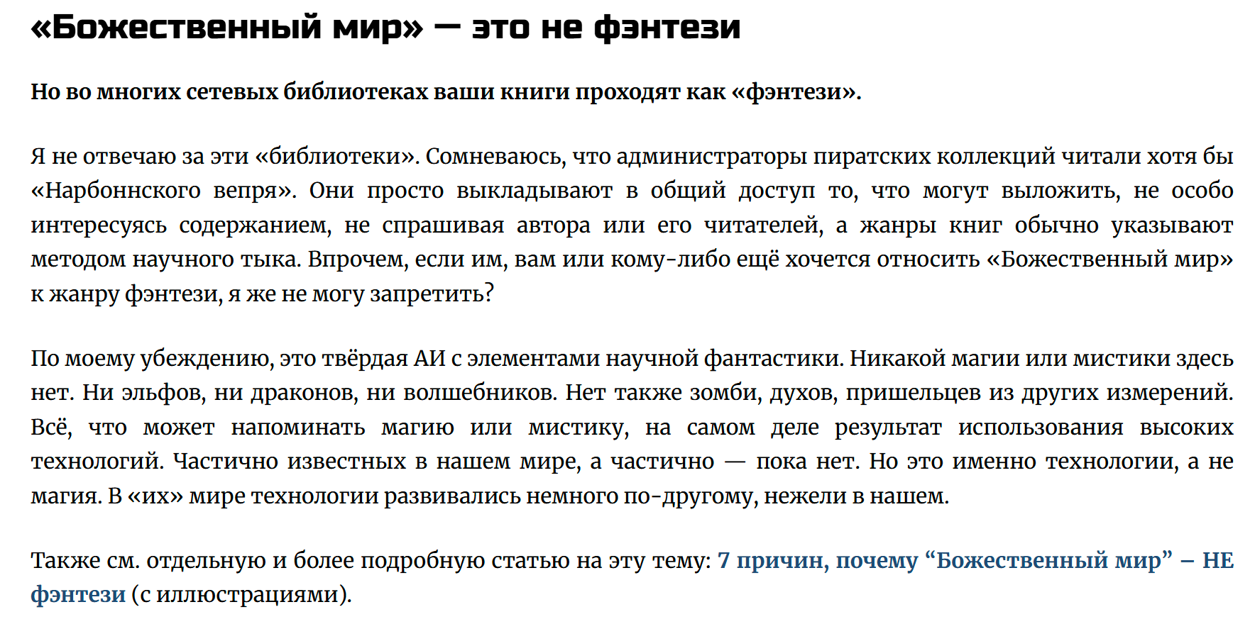 Наконец, есть Краткий путеводитель по альтернативно-исторической вселенной цикла «Божественный мир». Это совсем новый сборник материалов, не художка, а документал, но, судя по статистике, его читают активнее, чем сами книги. И есть старый сборник вопросов-ответов за 1999-2020 годы. Например:
