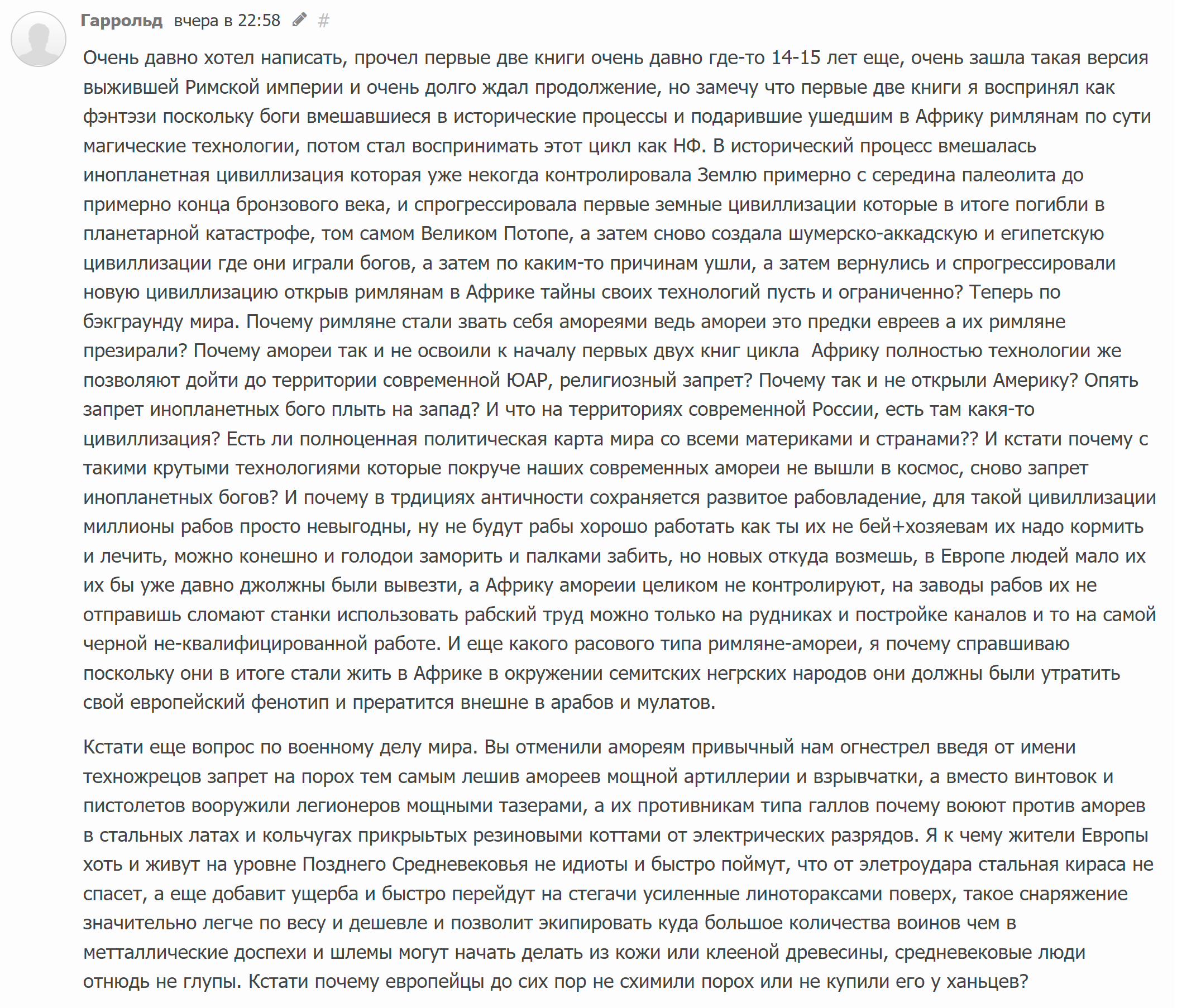 Автор: Борис Толчинский aka Брайан ТолуэллТолько-только думал написать, что за 5,5 лет на АТ так и не появилось ни одного читателя «Божественного мира», как… он появился. И оставил большой, ёмкий комментарий (скрин под катом) со своими впечатлениями и вопросами.
