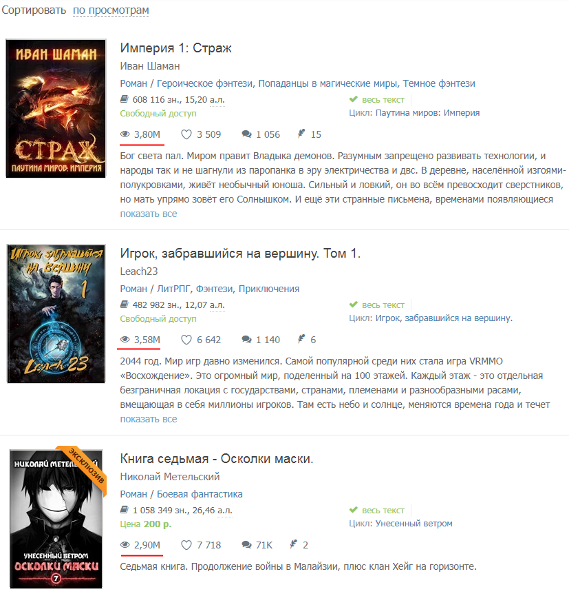 В общем, система подсчёта просмотров не покажет вам реальный интерес пользователей к вашему произведению. И даже близко не окажется близко к числу купивших вашу книгу. Итоговые цифры будут куда скромнее.