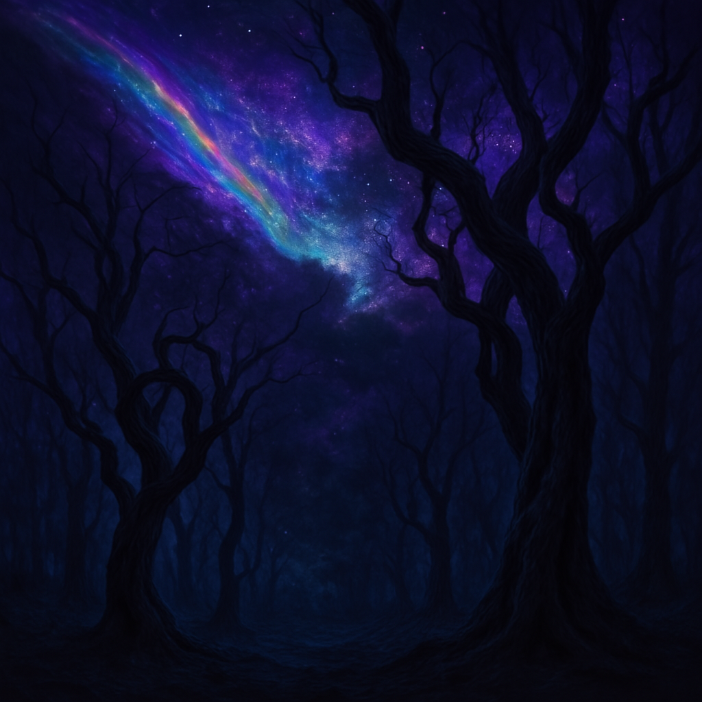 В каверне наступила ночь, и окружающий пейзаж выглядел настолько сюрреалистично, будто его породила галлюцинирующая нейросеть. Небо переливалось фиолетово-синей радугой, как масляная плёнка на луже из-под необслуженного двигателя. Сквозь грязные разводы пробивалось мерцание ближайшей туманности, и преломлённый свет создавал причудливые пятна во мраке притихшего леса. Перекрученные, душащие друг друга стволы деревьев тянулись вверх, как руки грешников на старинных картинах.