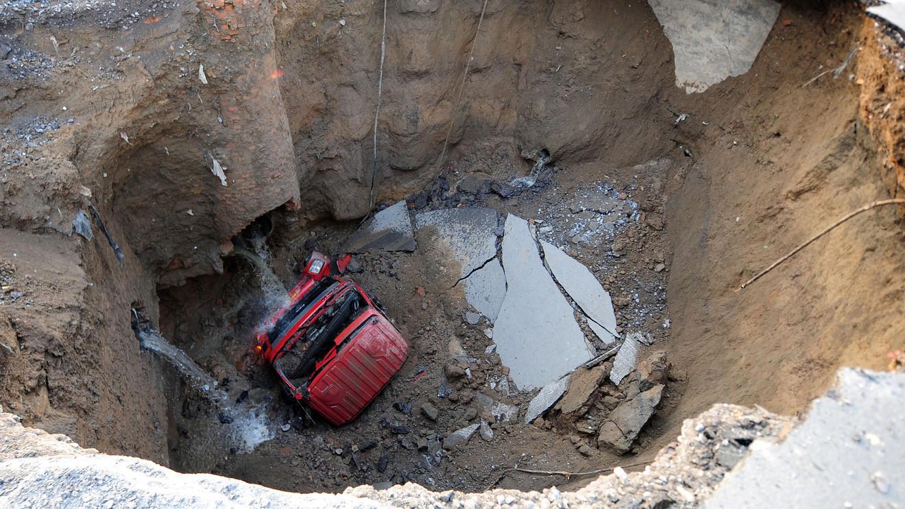 А ещё бывает, что никаких полостей сначала под городскими улицами и не было вовсе, но приходят люди и начинают копать канавы, в которых проводят трубы с водой, отоплением, канализацией. И отдают всё это хозяйство коммунальщикам, которые, как известно, очень любят собирать деньги с граждан, но содержать полученное хозяйство в порядке не очень любят. Поэтому всякие жидкости всё время из труб вытекают и размывают то, что вокруг них. Это уже не обязательно известняк, но может и песок, и глина, и всё в чём геологи разбираются. И снова полость – своды – нагрузка – бух!