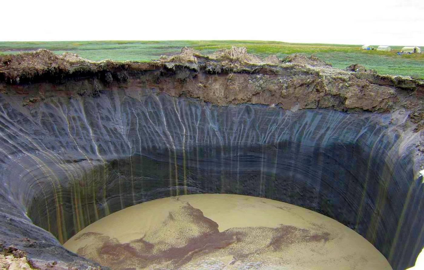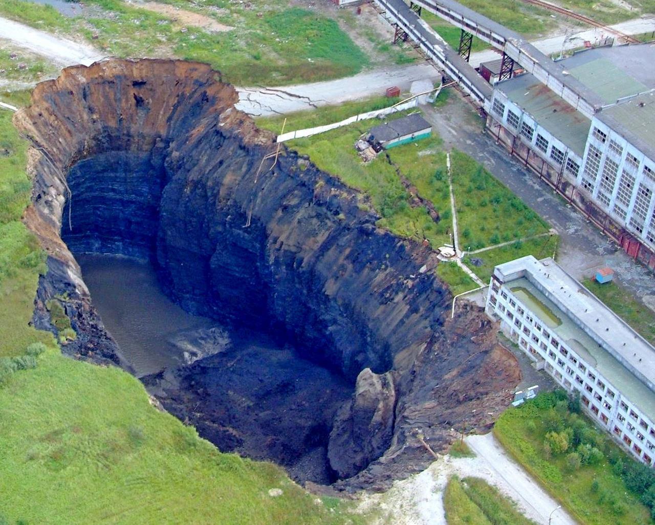 То есть на самом деле это не классический карстовый провал, а вообще следствие совершенно другого процесса. Да. В мире потеплело и древние болота, которые и есть «вечная мерзлота», начинают оттаивать. А воды там куда больше, чем земли. Вода утекает и остаётся яма. Ещё одно прямое следствие этого процесса – взрывные воронки в тундре. Только там не вода утекает, а под поверхностью скапливается метан. Потом давление нарастает и в конце концов возникает большой бум с образованием воронки. Впрочем, как на самом деле всё происходит, никто по-настоящему не знает. Эти процессы только начали всерьёз исследовать. А ямы продолжают возникать. Вот такие, как эта яма на Ямале: