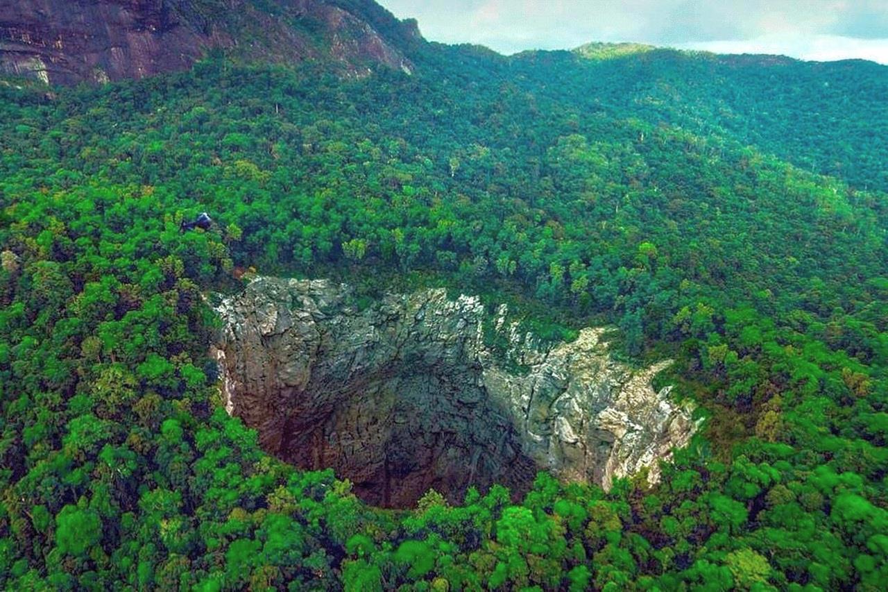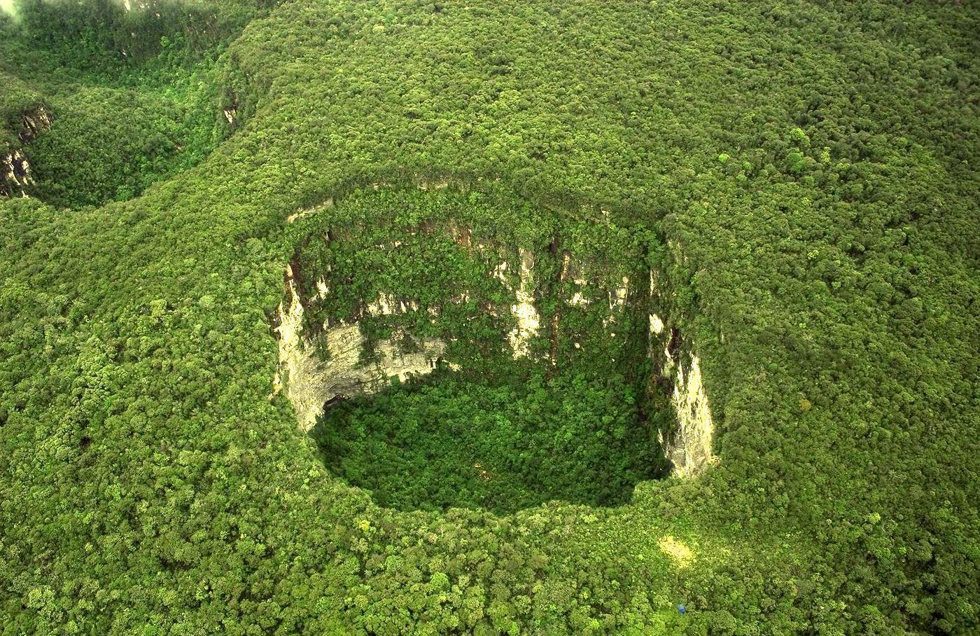 Самая большая яма там в глубину достигает 662 метра, а в диаметре намеряли больше 520 метров. Говорят, что всё это образовалось именно по причине вымывания известняка. Теперь вот на дне ямы растут кусты, деревья и вообще сформировалась «уникальная экосистема». Ну, а куда ей было деваться-то? Тут хочешь-нехочешь, а придётся формироваться.