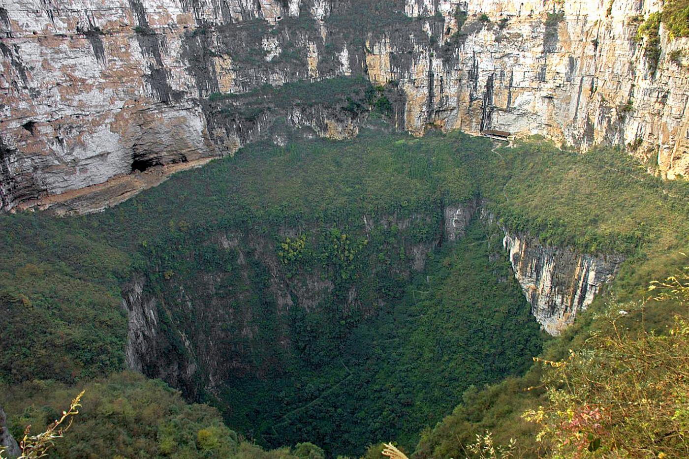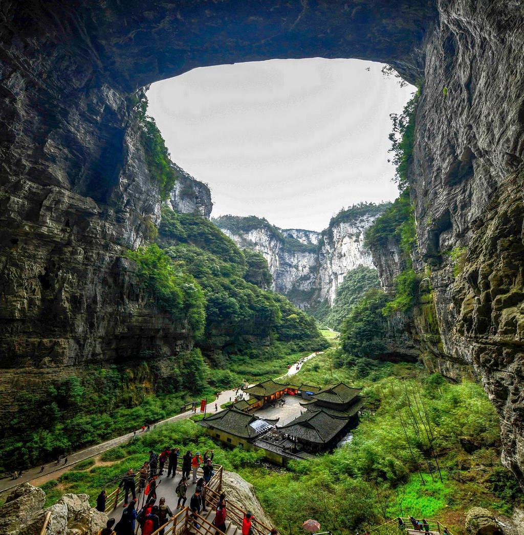 Самый здоровенный такой провал, а точнее целый район с провалами находится на юге Китая, провинция Чунцин. Называется это место Сяочжай Тянькэн и это уникальное место для любителей путешествий. Пара фоток с этого района кого угодно могут сподвигнуть на фантазии о приключениях: