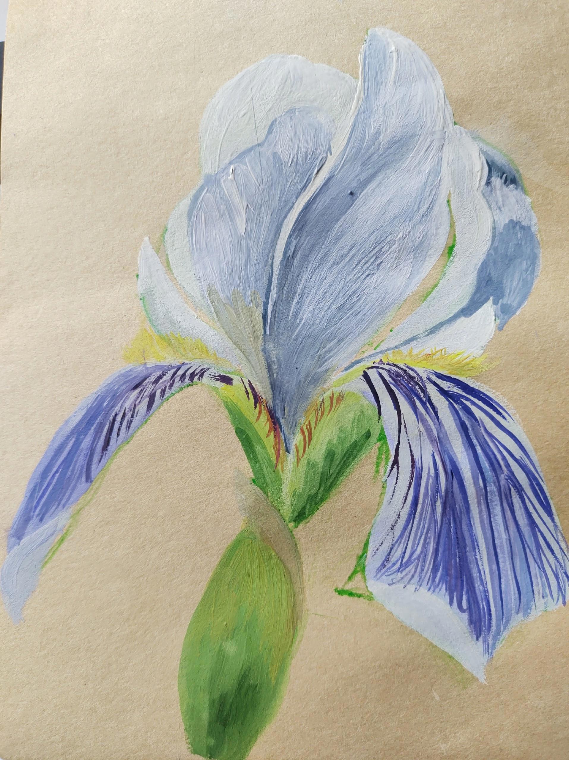 Замучала я этот ирис немного, все никак не могла попасть в тень нормально. В последнее время у меня вся тень выходит с увеличенной контрастностью, пока не понимаю, что с этим делать. От материала не зависит, что с акварелью, что, как видите и с гуашью - все тоже самое.