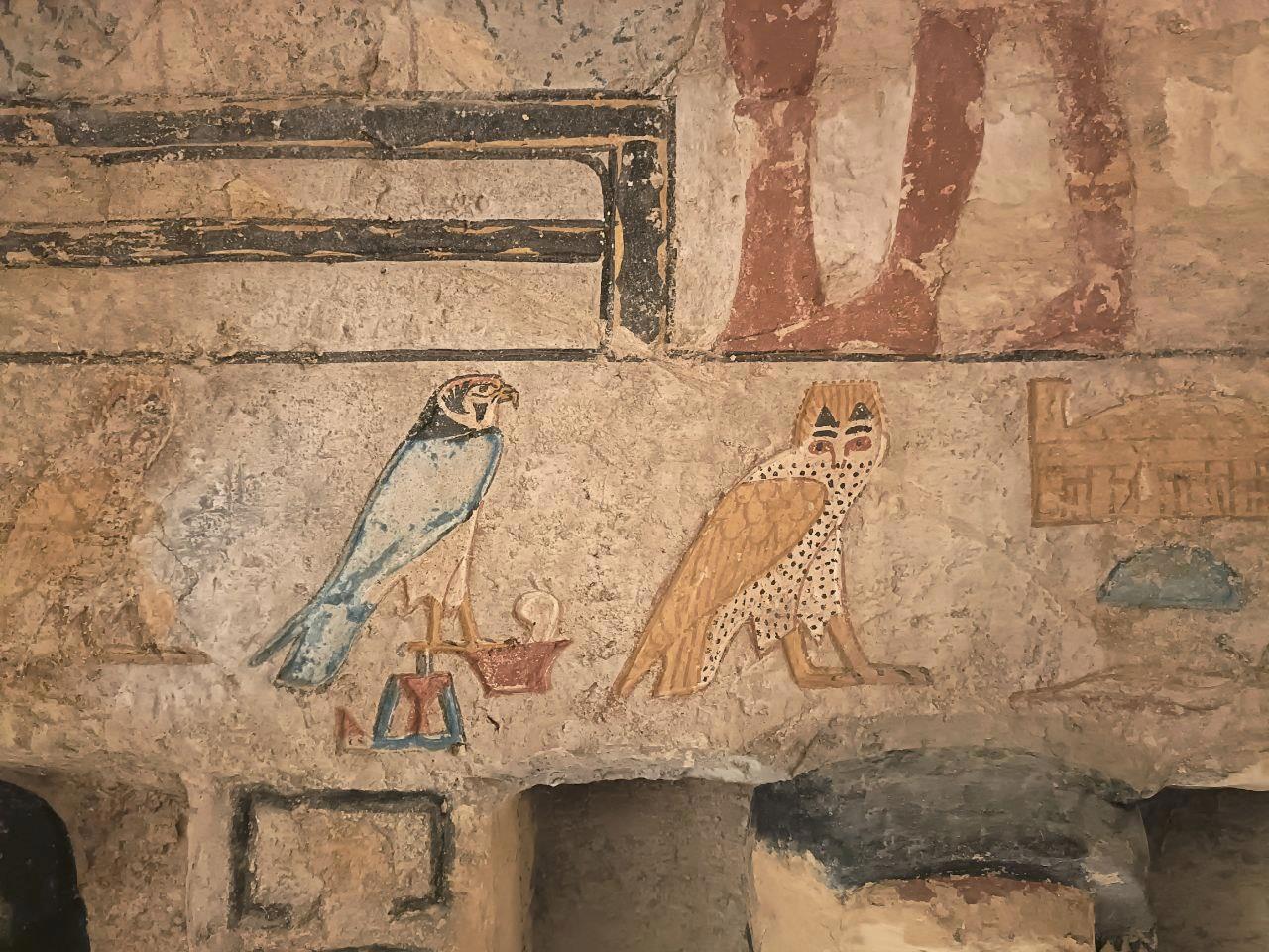 На фото знаменитые птички из гробницы Неферхеренптаха, которая датируется 2400 г. до н.э. Эта картинка ровесница пирамид на Гизе. Ей больше четырех с половиной тысяч лет! А если вы посмотрите на крайнее изображение справа, то увидите дом богатого египтянина той поры с озером.